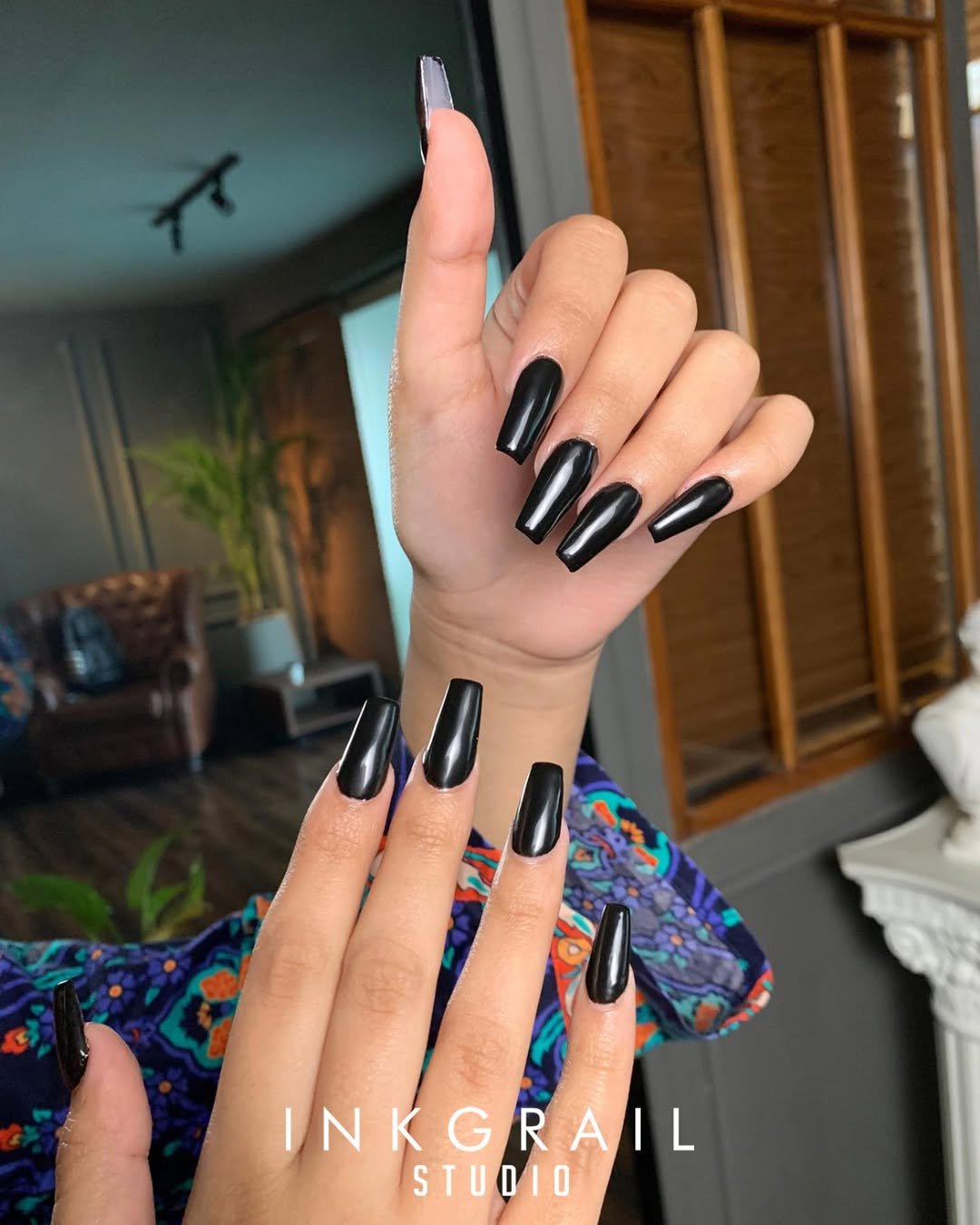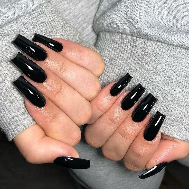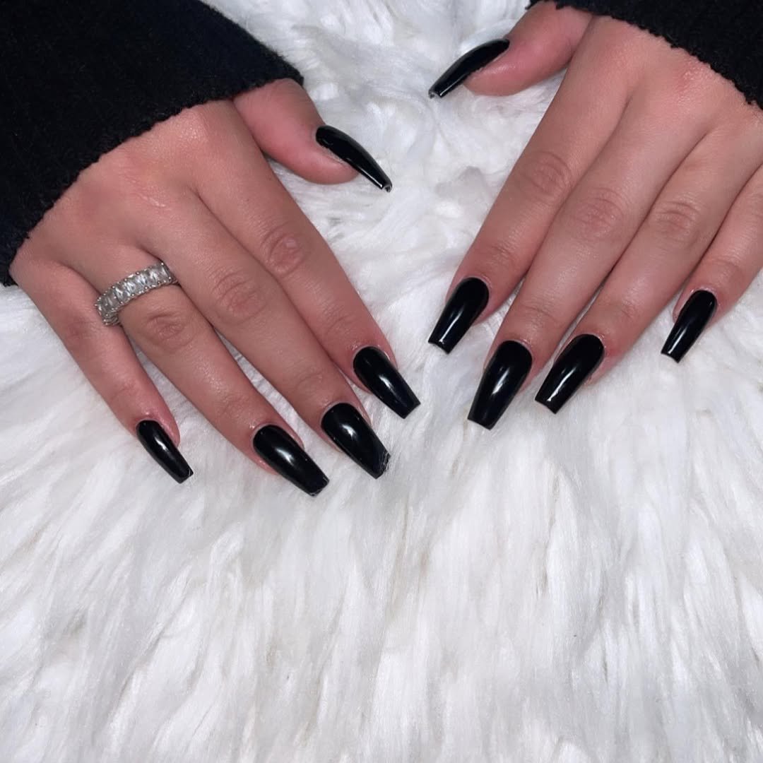 These are pure blackout nails done to perfection — smooth finish, crisp coffin shape, and that mirror-like shine that catches light from every angle.