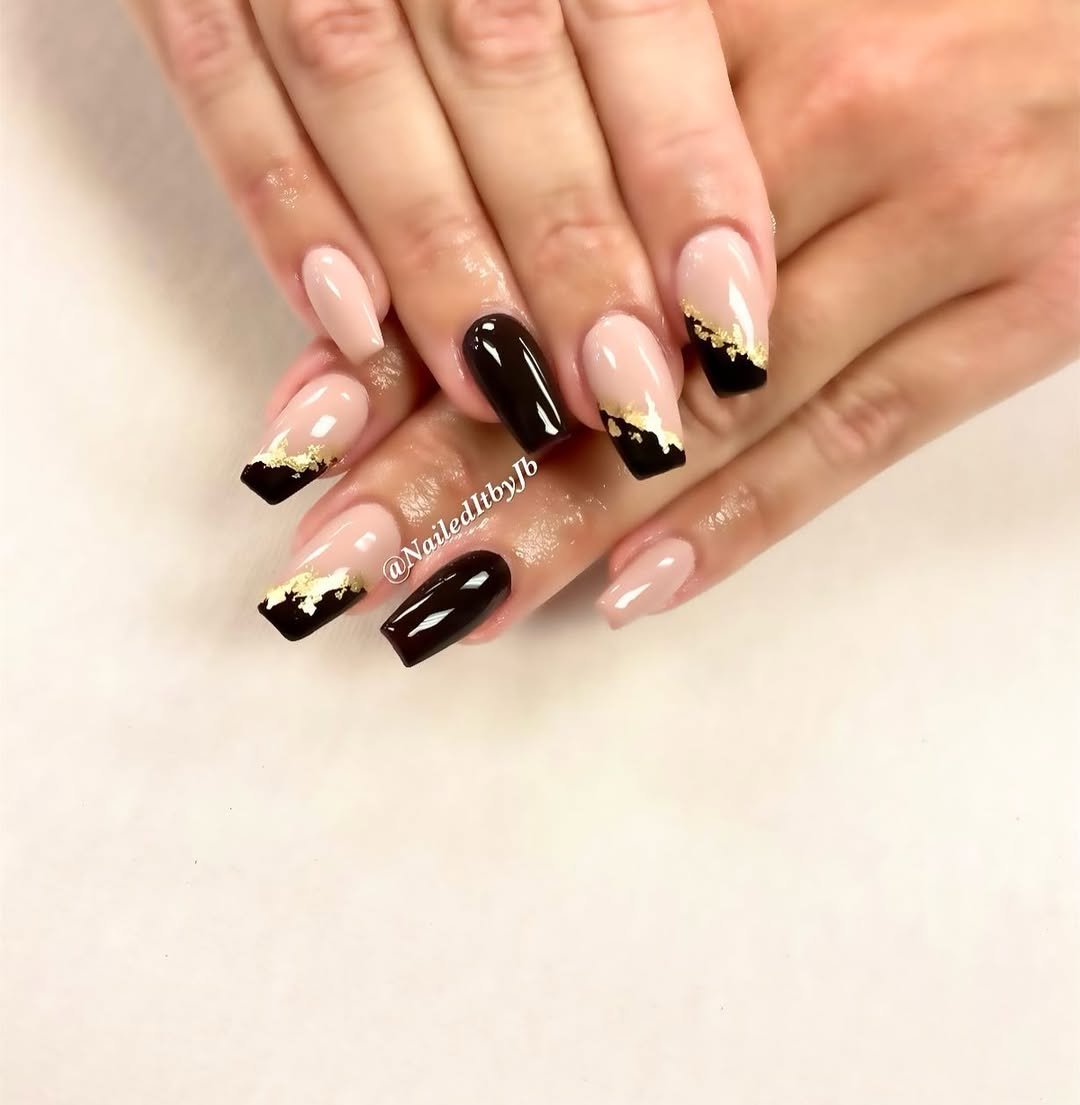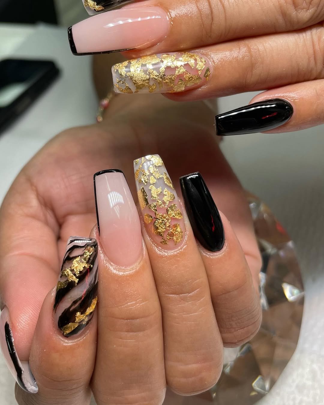 Here’s where soft meets luxe. Nude bases paired with glossy black and delicate gold foil accents create a look that feels elevated but still wearable.