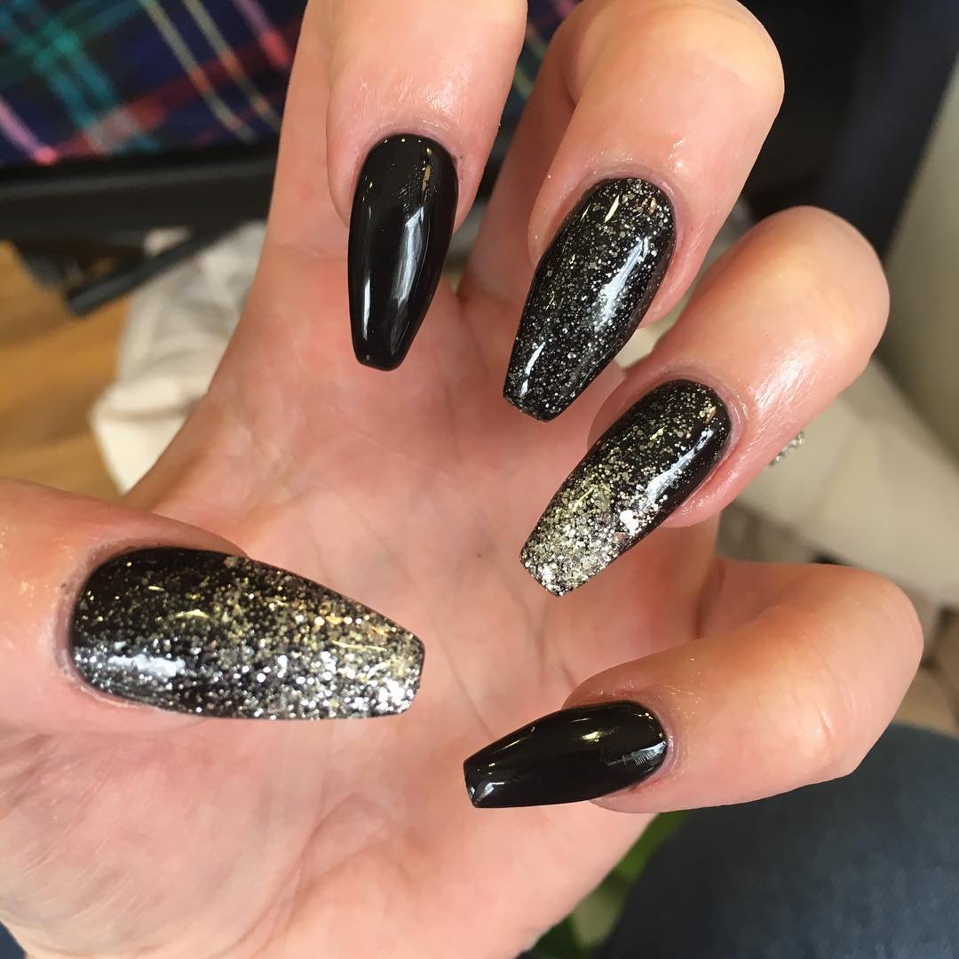 This one brings the sparkle. Glossy black paired with a gold glitter fade creates that luxe, night-out vibe instantly. It catches the light in the best way.