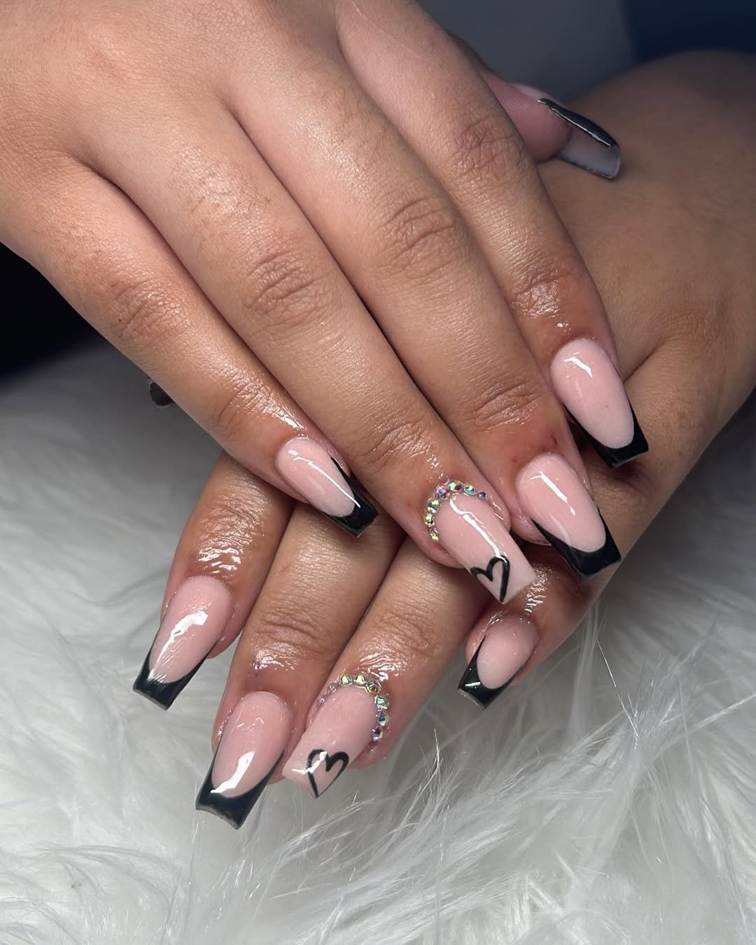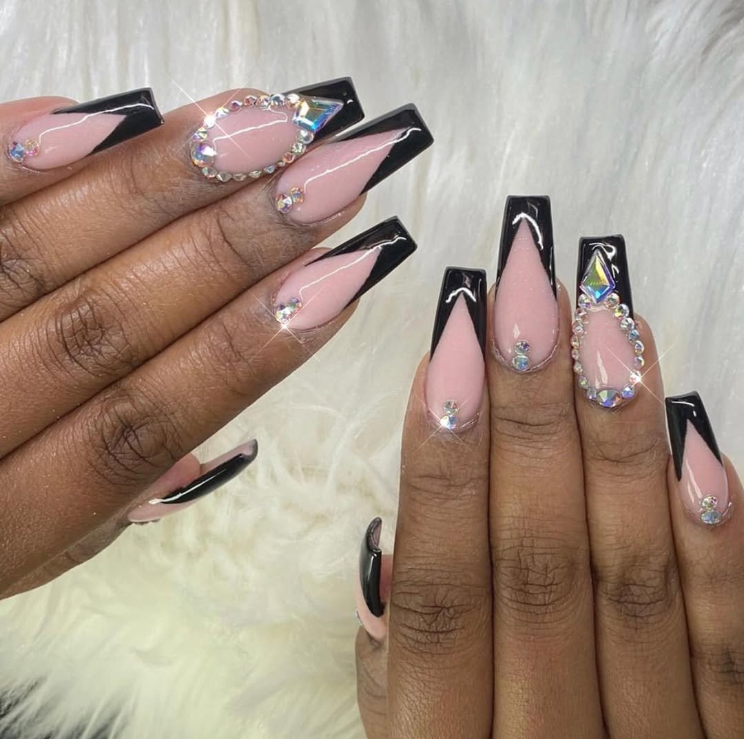 This set plays with contrast in the prettiest way — soft nude bases meet crisp black tips, with just enough crystal detail to keep things interesting. It’s giving “classic French,” but upgraded with a little edge and sparkle.