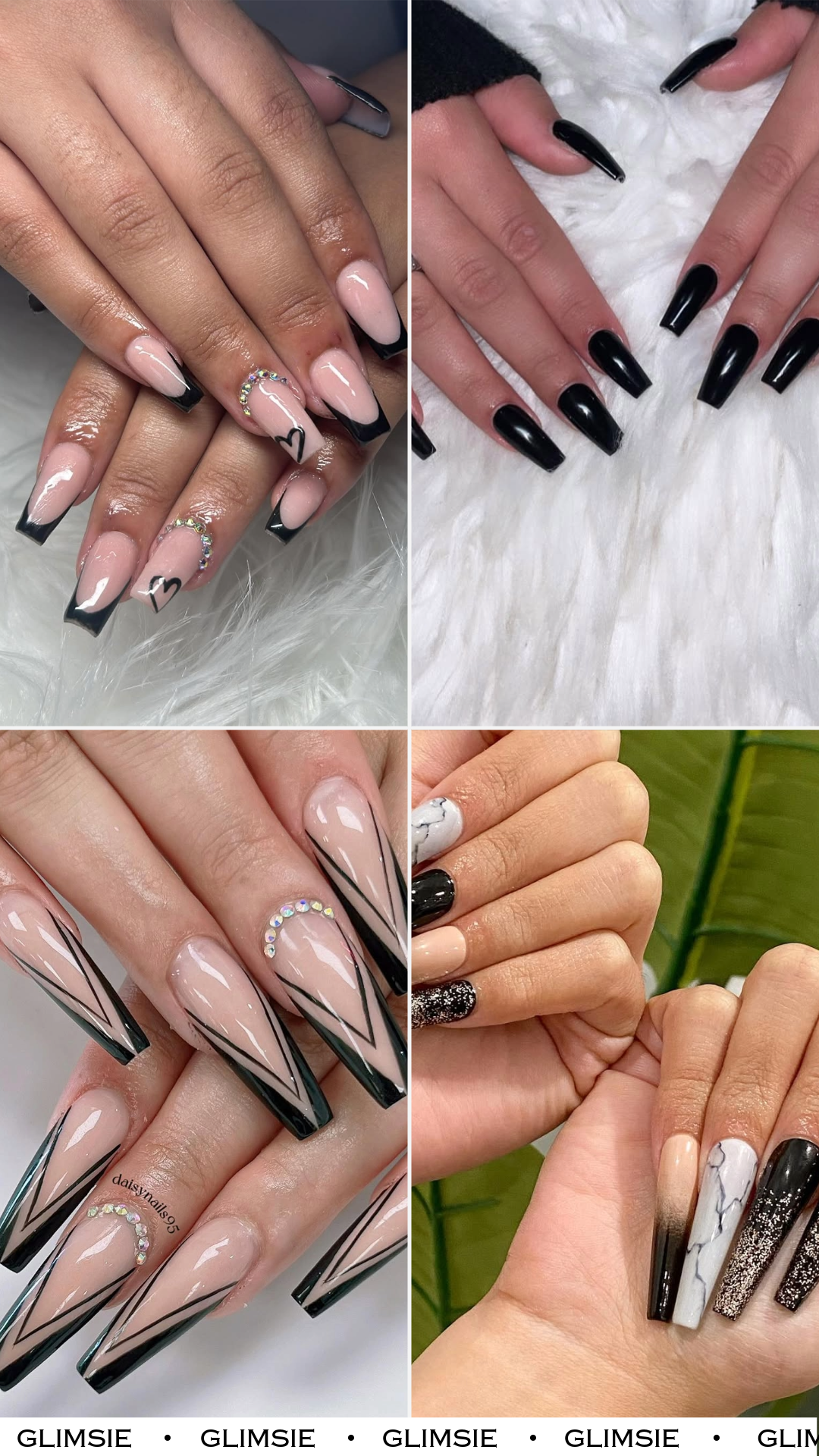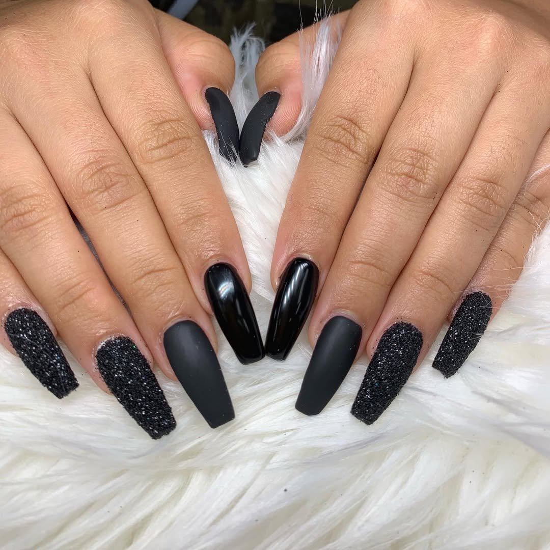 This set plays with glossy black, matte black, and textured sparkle all in one go — and somehow it still feels cohesive. The coffin shape keeps everything sharp and intentional.