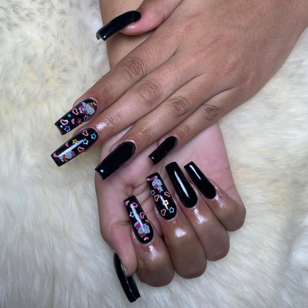 Hello Kitty accents on black coffins? Say less. This design blends playful charm with dark glam, creating that perfect balance between sweet and edgy.