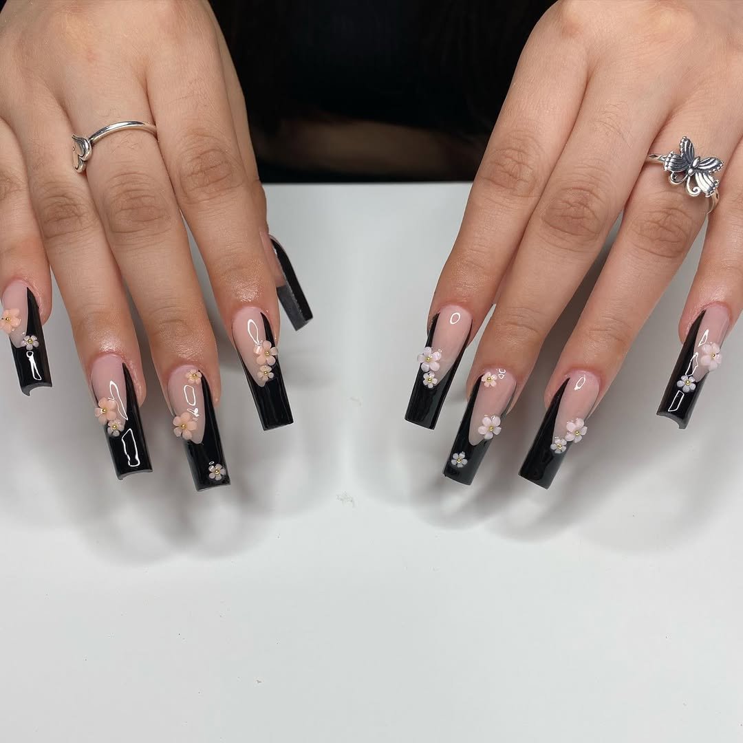 This look keeps things refined with black coffin tips and soft nude bases, elevated by subtle floral accents. Clean lines, glossy finish, and just enough detail to feel special.