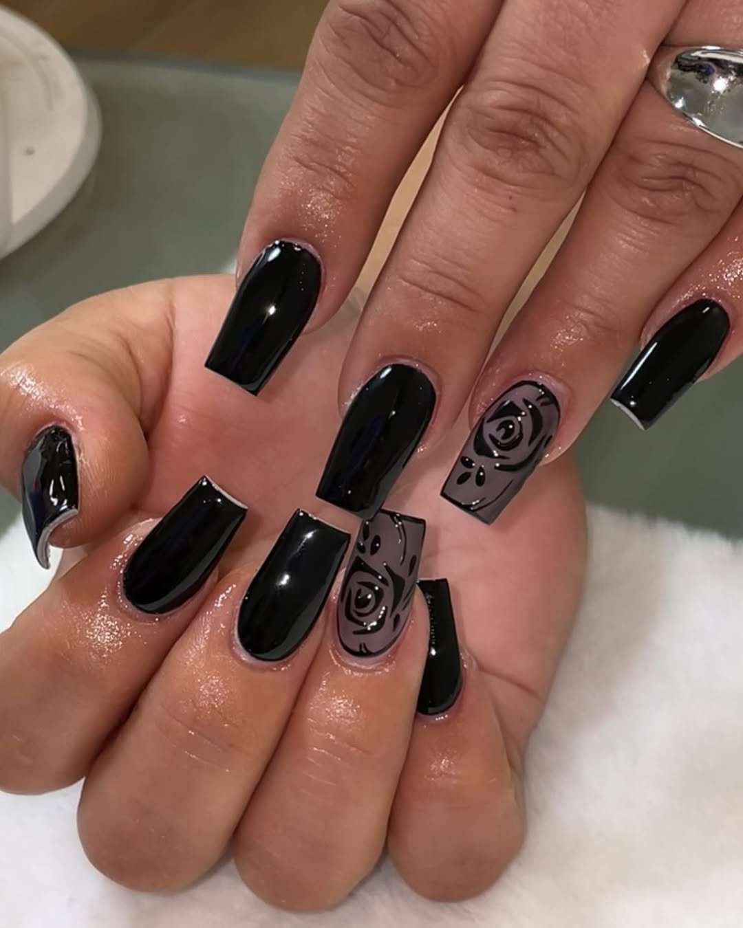 High-shine black coffin nails always hit, but those sheer accent nails with the black rose design? That’s where the magic happens. It adds just enough softness to break up the boldness.