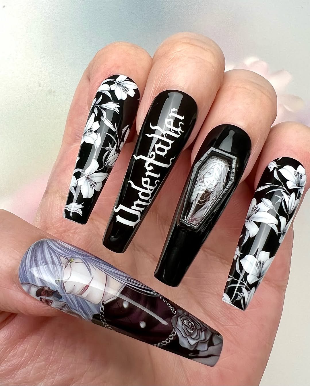 Now this is dark art. Black coffins layered with white florals, gothic lettering, and coffin-shaped details create a full-on statement set that’s impossible to ignore.