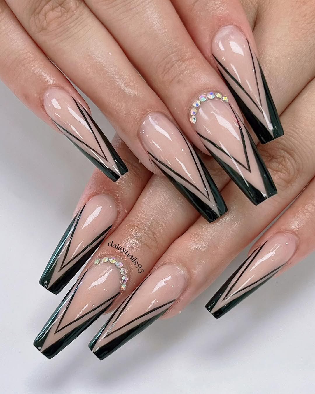 Sharp black lines over nude create this sleek geometric vibe that feels modern and edgy. Add a touch of crystal detailing, and suddenly it’s giving runway energy.