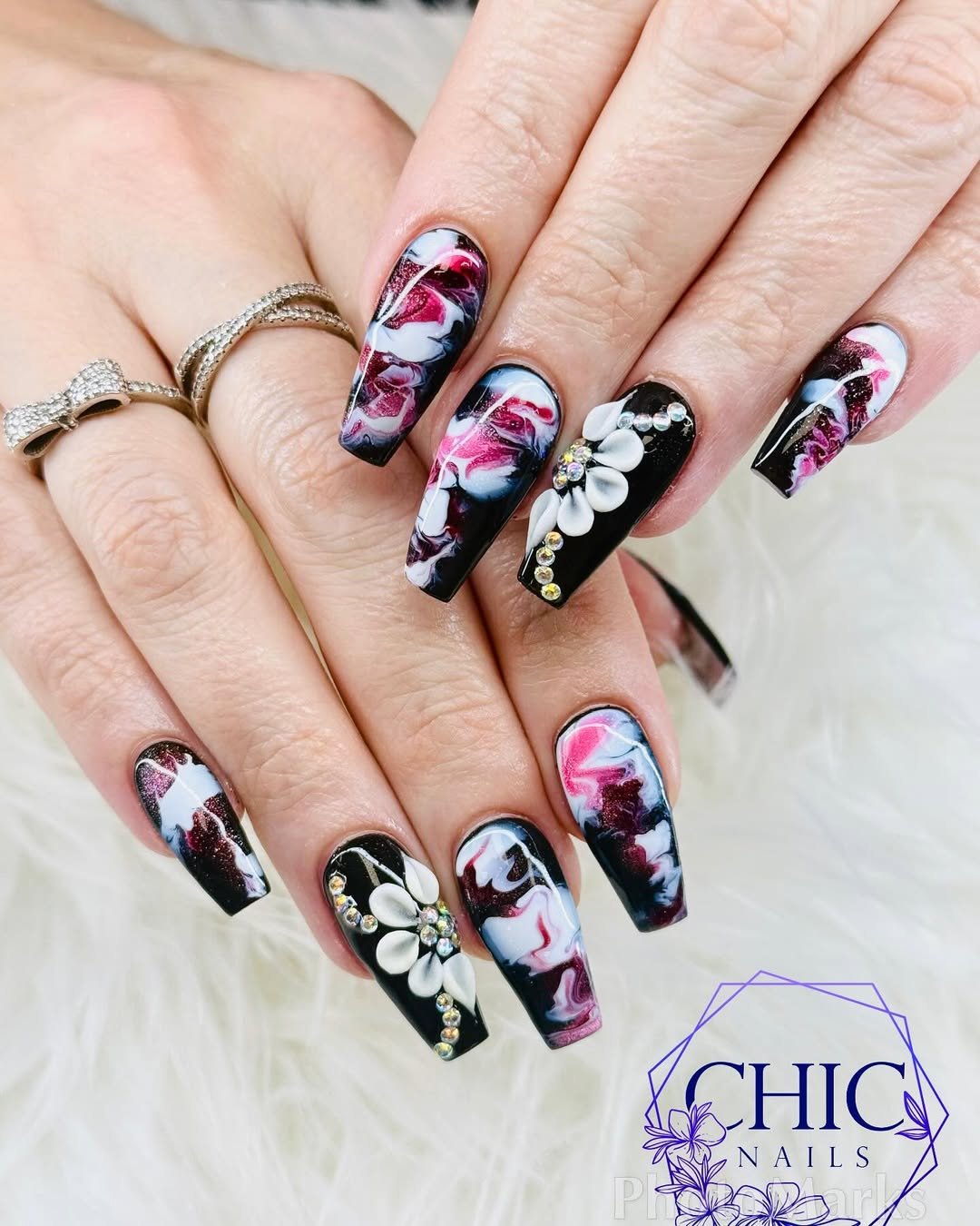 Swirled marble tones mixed with black coffins? Absolutely stunning. The pops of pink and white create movement, while the rhinestone flower steals the spotlight in the best way.