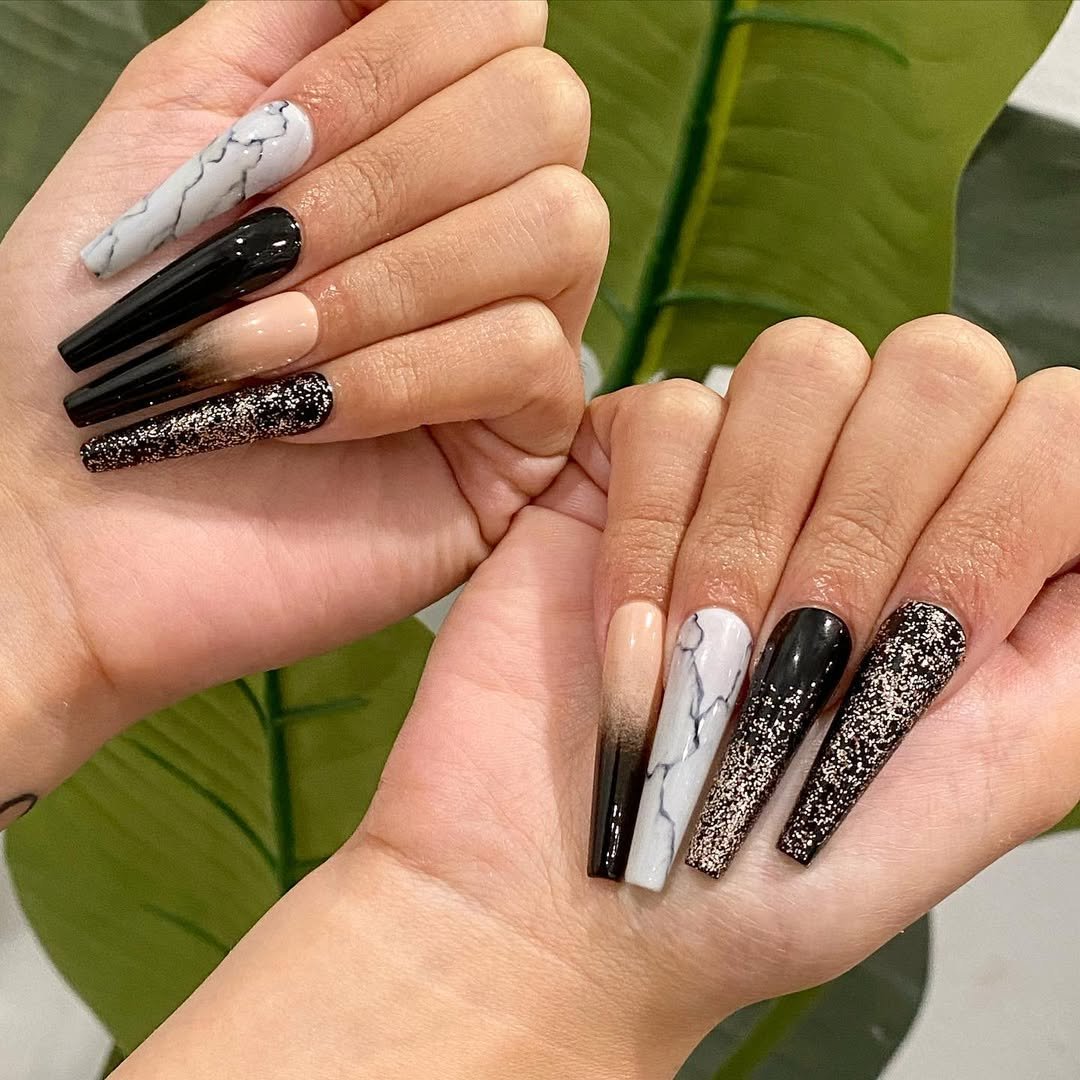 This set is all about contrast done right. You’ve got glossy black, soft nude fades, crisp marble, and that glitter accent that sneaks in like a quiet flex. Every nail feels intentional, but nothing feels overworked.