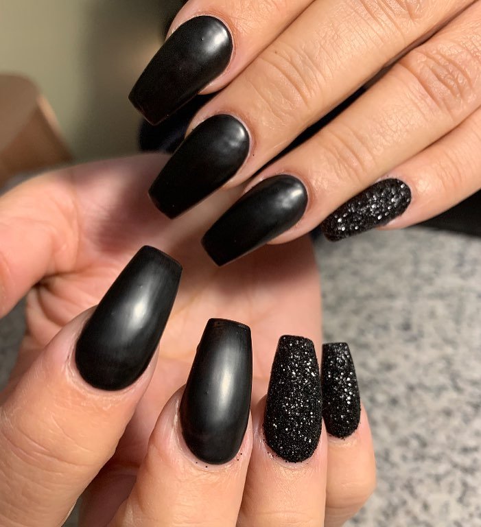 Matte black coffins already carry serious attitude, but that textured glitter accent nail takes it to another level. The contrast between smooth matte and sparkly grit is so satisfying.