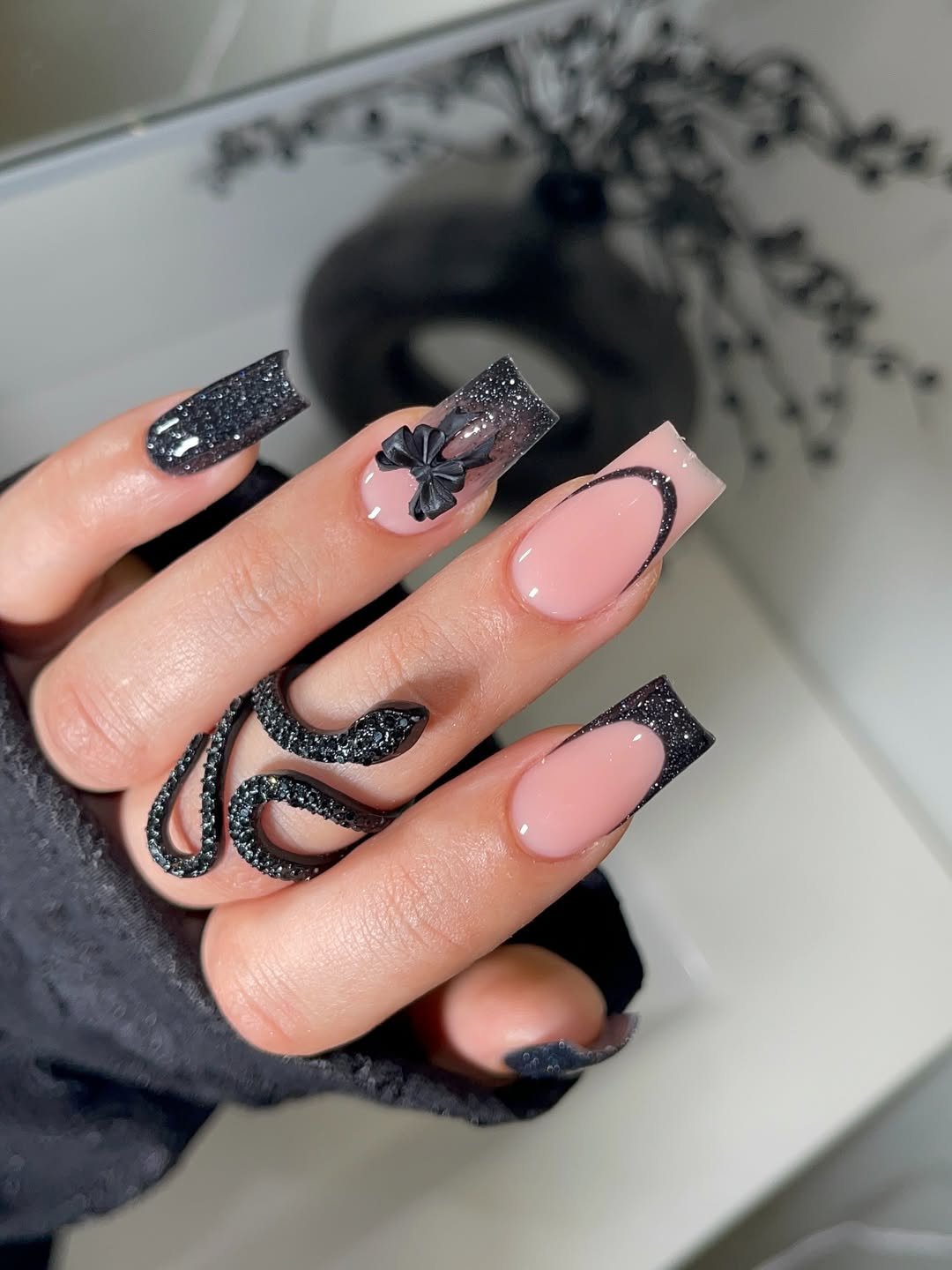This set leans into dark glamour with glittery black tips, soft pink bases, and a statement 3D flower moment. It’s dramatic — but in a classy way.