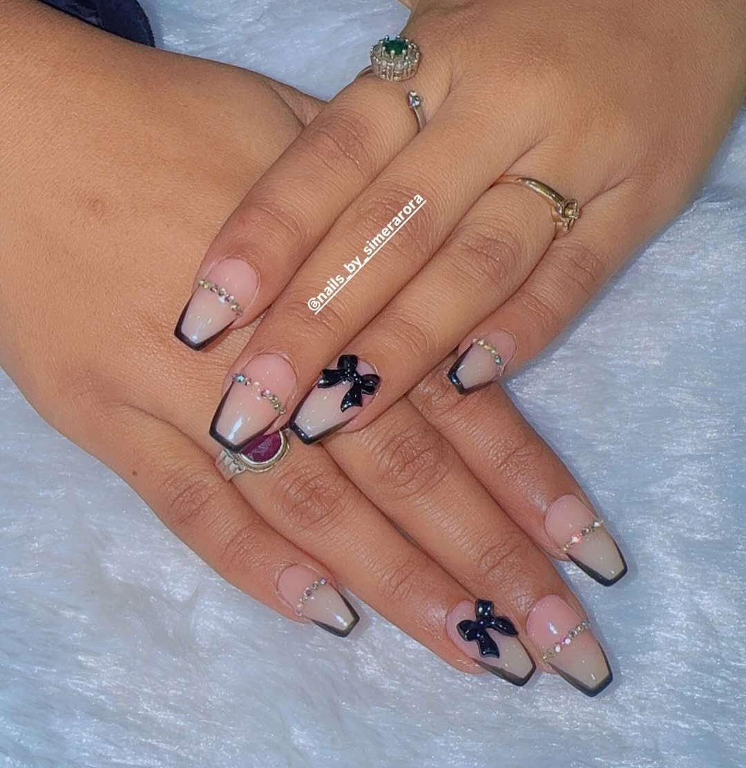 This set feels soft at first glance — nude base, slim black French tips — but then the rhinestone chains and 3D bows step in and completely elevate it. It’s delicate, but not shy. Sweet, but still polished.
