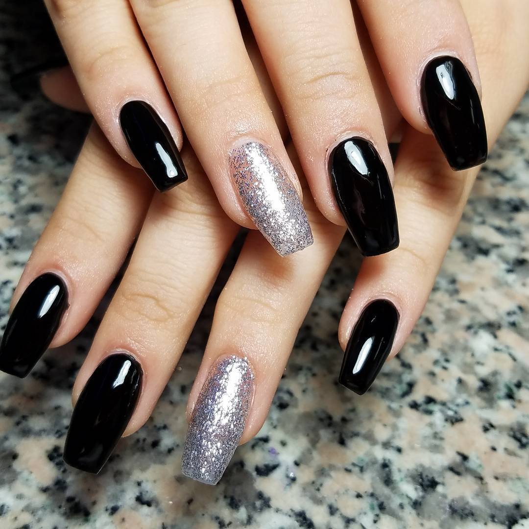 Black coffin nails with a single silver-glitter standout? Yes please. The contrast hits just right — sleek, shiny, and surprisingly playful.