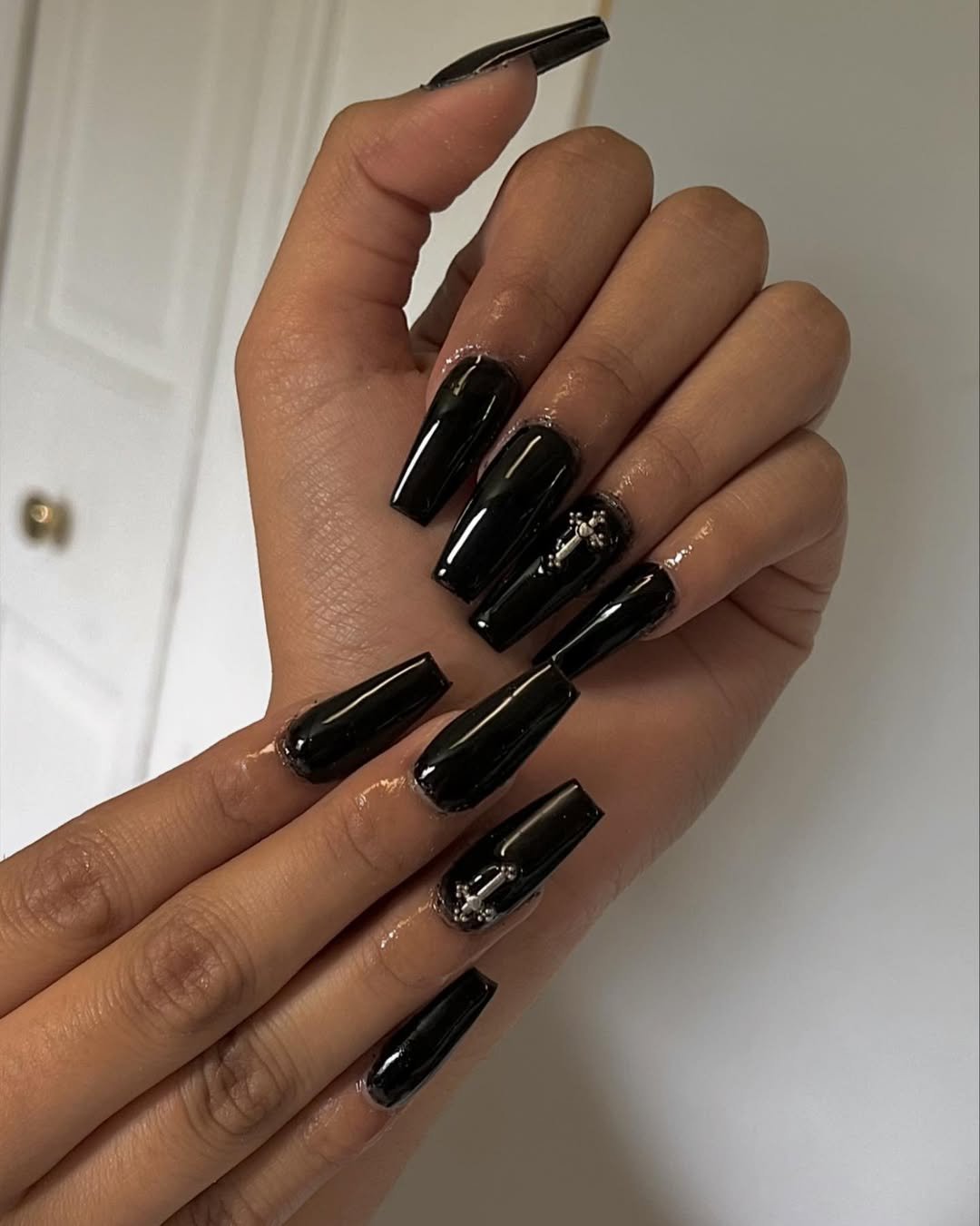 Glossy black coffins get a glow-up with tiny crystal accents that add just enough sparkle without stealing the show. Clean lines, luxe finish, zero clutter.