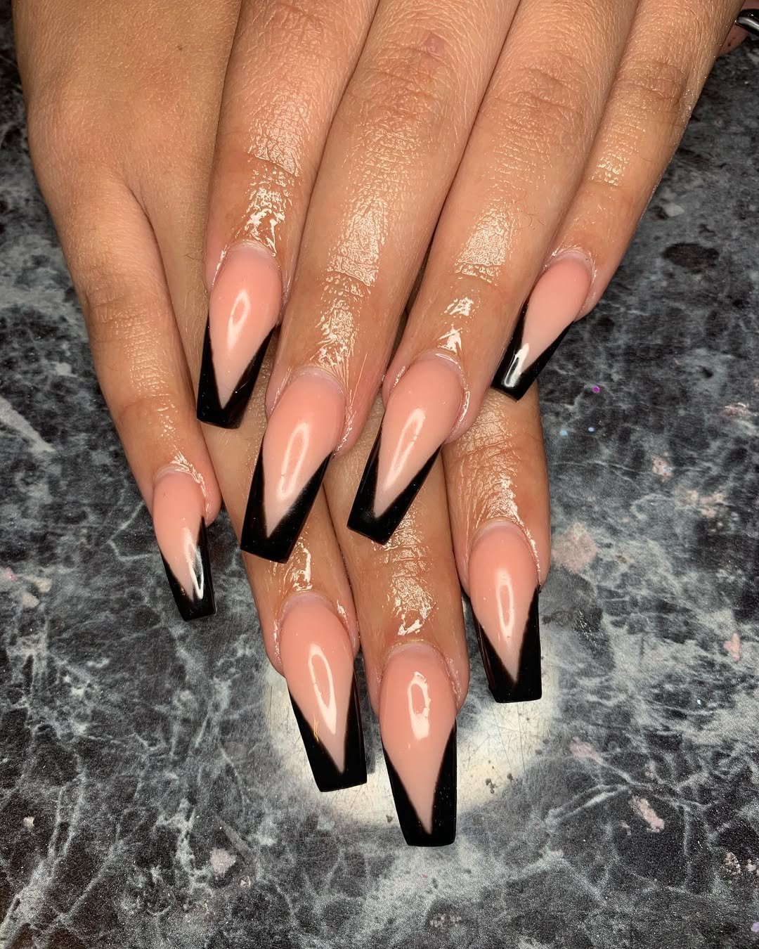 A nude coffin base with crisp black French tips is always a win — but this set takes it further with that extra-clean finish and flawless shaping.