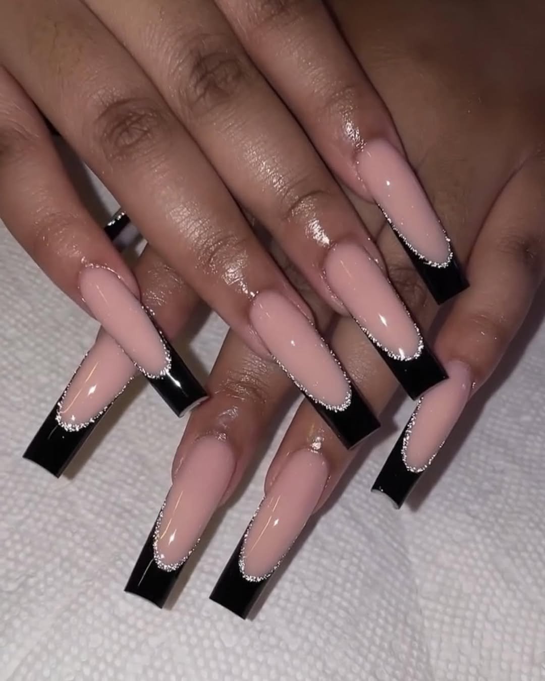 Clean nude coffins paired with black tips and tiny glitter outlines make this set feel polished and refined. It’s understated glam at its finest.