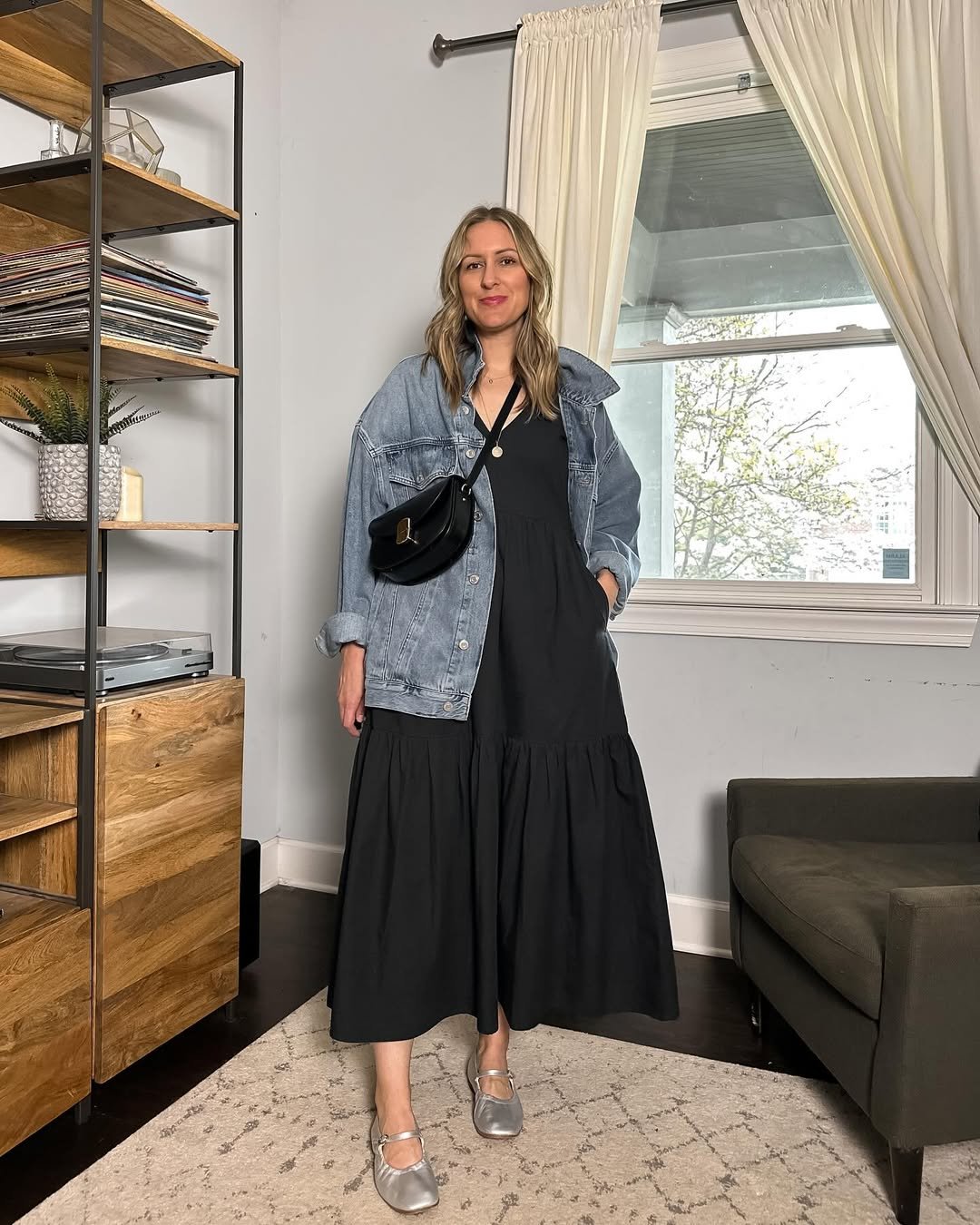 @michelle_tomczak makes casual feel elevated with a flowy black maxi layered under an oversized denim jacket. It’s cozy yet cool, the kind of look that works just as easily for coffee runs as for a creative day out.