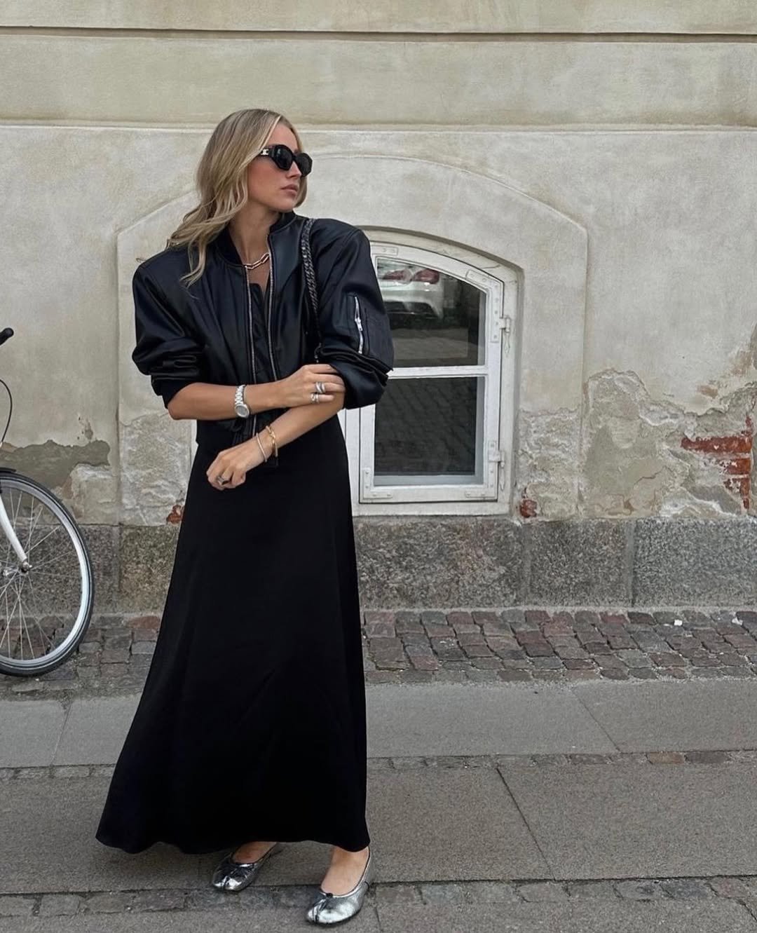 @the_reflective_ brings Copenhagen street style to life with this long black dress and puff-sleeved bomber combo. The contrast of structure and fluidity is spot-on, while the silver flats add just the right amount of shine.