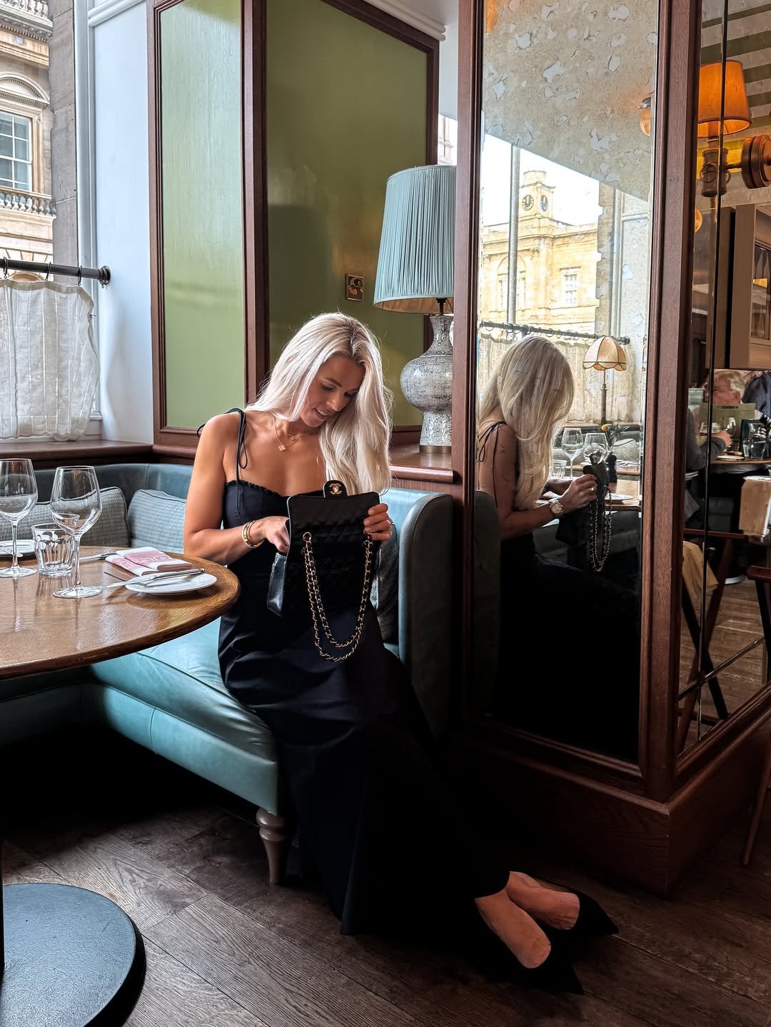 @alise.cameron serves sleek sophistication with this minimalist black evening look. The strappy gown drapes beautifully, balancing structure and fluidity, while the black chain bag adds that subtle edge. It’s the kind of outfit that whispers luxury rather than shouting it.