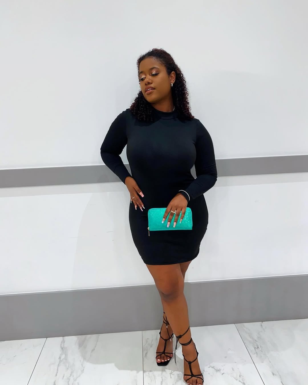 The @gabby.alleyne look is chic simplicity with a pop of bold color. The fitted long-sleeve mini dress is the definition of understated glam, while that emerald green clutch brings life to the monochrome.