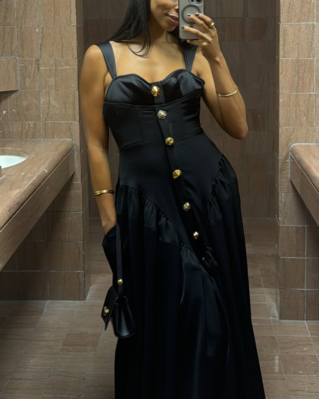 This first look from @waityouneedthis is giving modern royalty. The satin sheen, sculpted bodice, and bold gold buttons—every detail whispers luxury. It’s elegant yet dramatic, a masterclass in how to make black feel opulent.