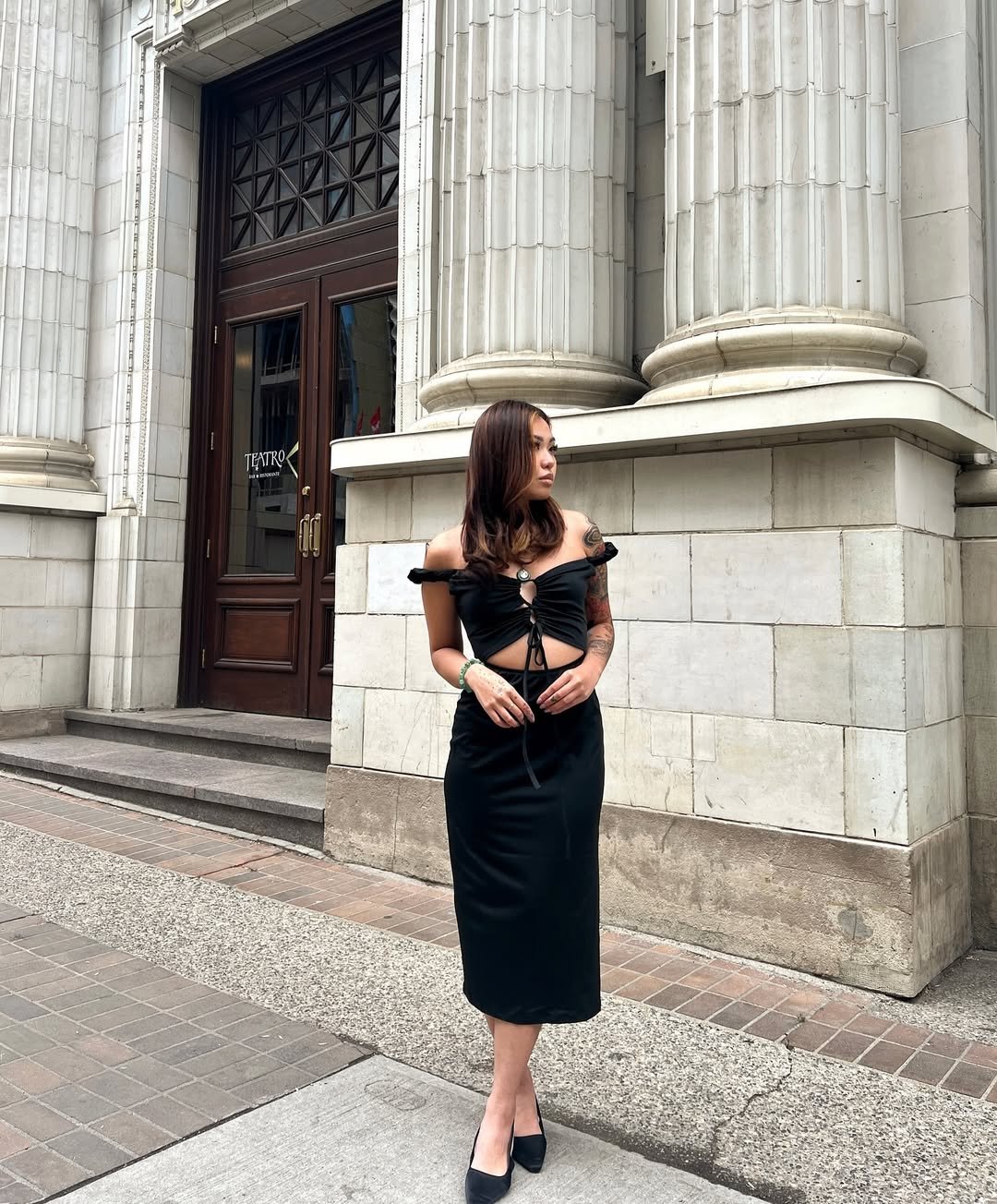 @julie.hluu brings timeless femininity to the streets with this off-the-shoulder black midi. The tie-front detail adds just enough playfulness, keeping the look sultry but never overdone. It’s that perfect blend of old-world charm and modern edge, made for wandering through the city with confidence.