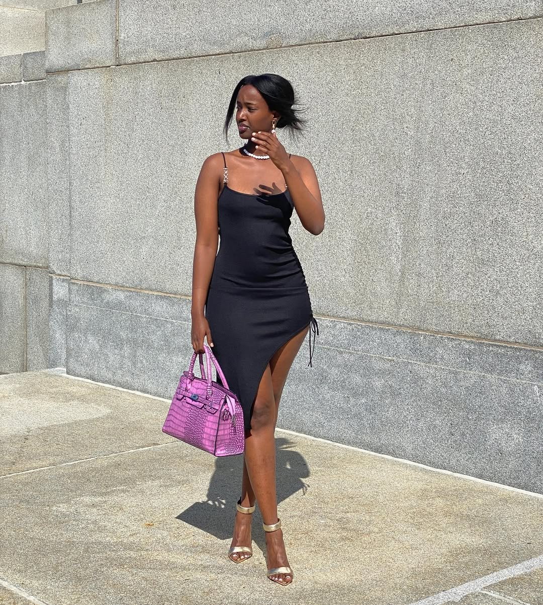 @blonia21 keeps it sleek and daring with this asymmetric black dress that proves minimal doesn’t mean boring. The leg slit adds just enough heat, while the pink crocodile bag brings in personality and playfulness.