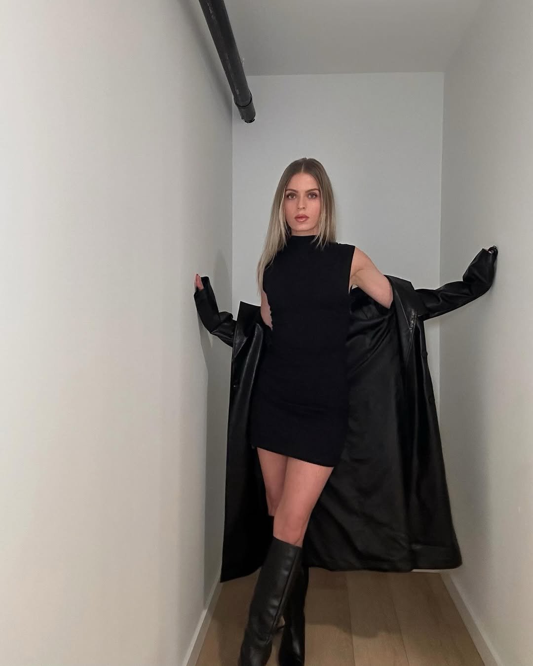 @holl_ward channels total cool-girl vibes in this edgy black mini dress and leather coat combo. The knee-high boots make it city-chic, and the neutral hallway setting gives it that editorial, “caught-in-motion” energy.