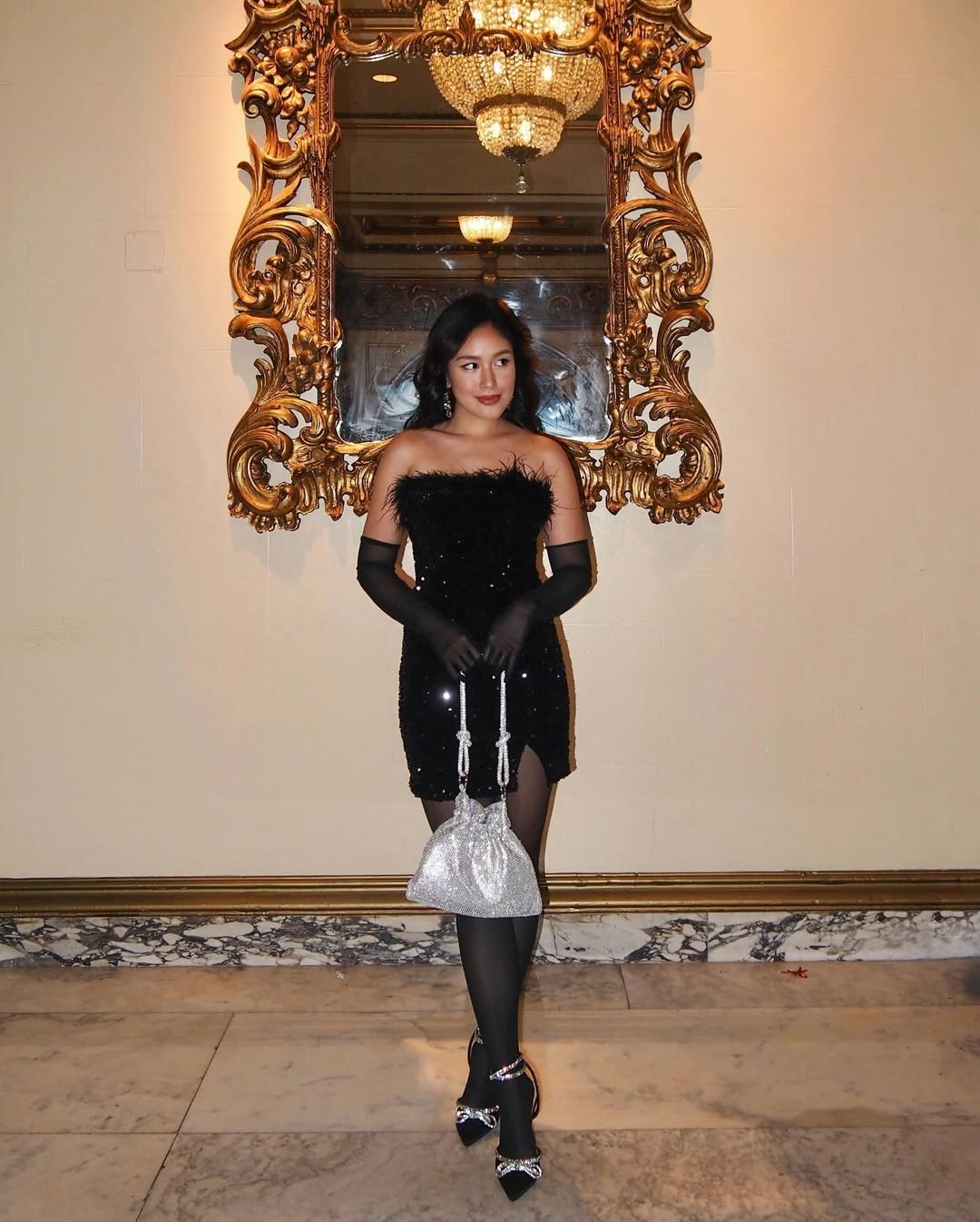 @margieeev gives us pure vintage glamour. The strapless, feather-trimmed mini paired with sheer black tights and gloves feels like a love letter to old Hollywood elegance. The silver bag and sparkling heels catch the light just right, creating that perfect red-carpet gleam.