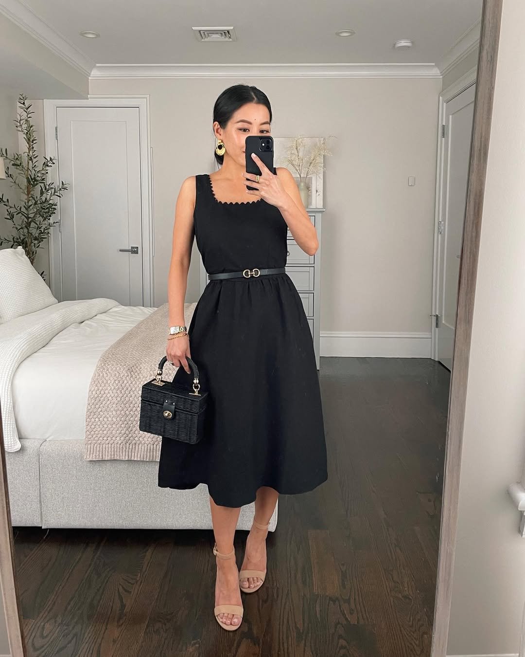@jeanwang shows us how timeless a black midi dress can be when styled right. The belted waist, structured handbag, and neutral heels make it sophisticated but never stuffy. It’s elegance with intention.