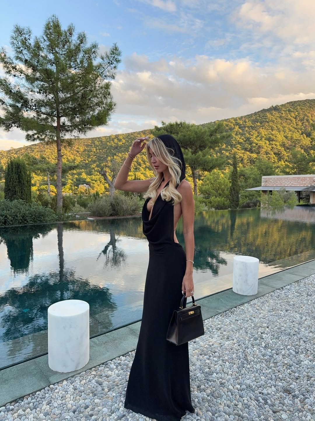 The @mathilde_capp look redefines black-tie minimalism. This draped halter gown flows like liquid under the soft evening light, with a plunging neckline that feels both relaxed and refined. The structured mini bag and wide-brimmed hat keep the look grounded in quiet confidence.