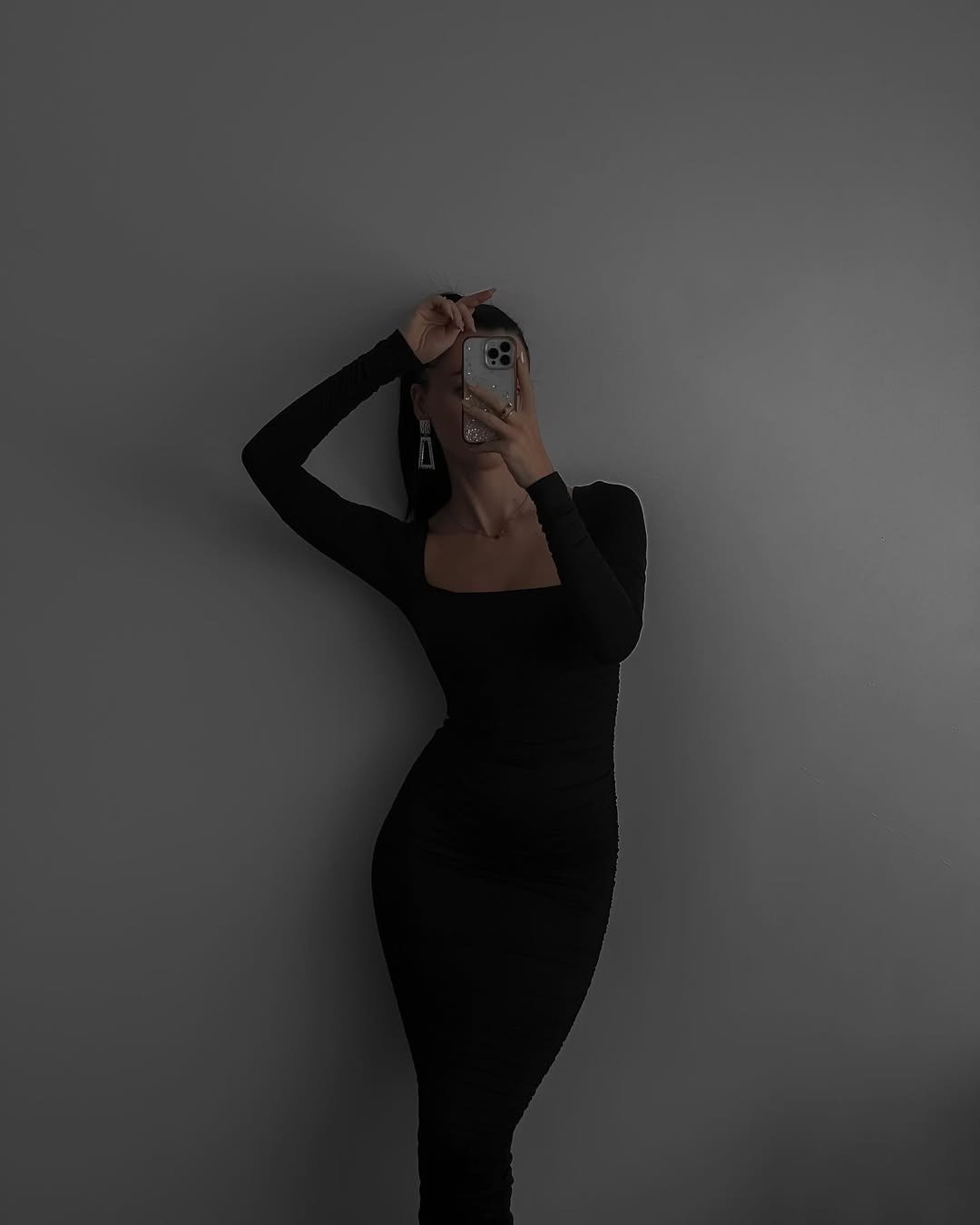 @thebrunetteinblack proves that minimalism can still make a statement. This body-hugging long-sleeve dress, paired with sculptural earrings, feels sleek, moody, and impossibly cool. The muted gray backdrop only amplifies the monochrome magic—it’s a study in clean lines and quiet confidence.
