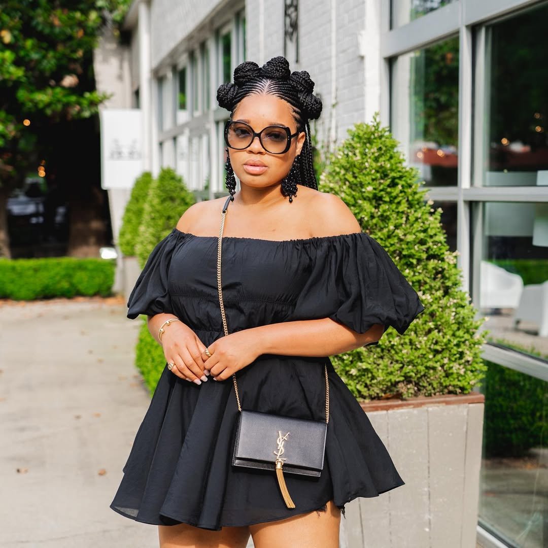 With her off-the-shoulder mini and YSL crossbody, @parke.avenue gives us sunshine and confidence in one effortless look. The puff sleeves and flared skirt bring just enough drama, while her oversized sunnies seal the deal on that “weekend chic” energy.