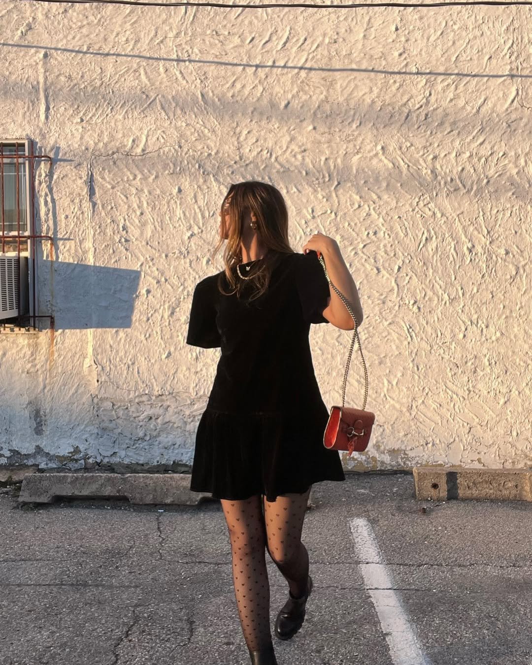 This look from @_laurgrace is pure downtown poetry. The soft golden light, the little black velvet dress, and those sheer heart-patterned tights? Perfection. It’s giving vintage soul with a modern twist—effortless yet intentional, like she just stepped out of a French film.