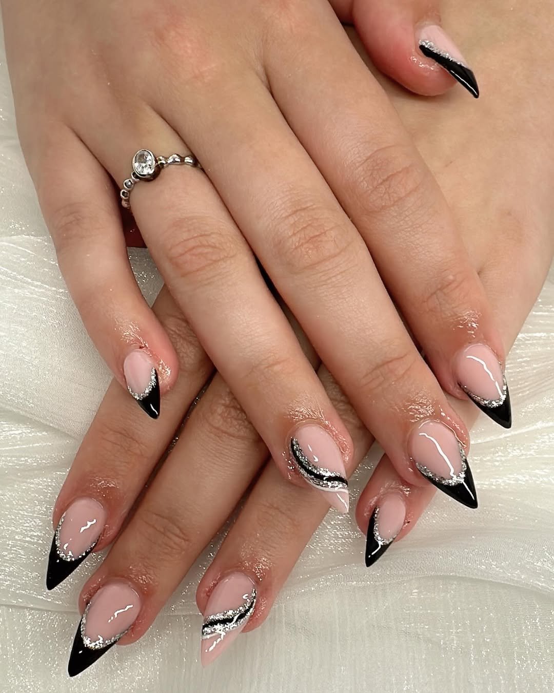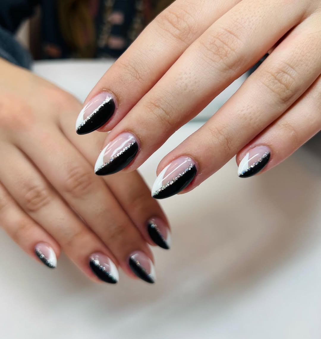 The diagonal black and white split with a sparkly silver line down the center? Chef’s kiss. It’s structured but still playful.