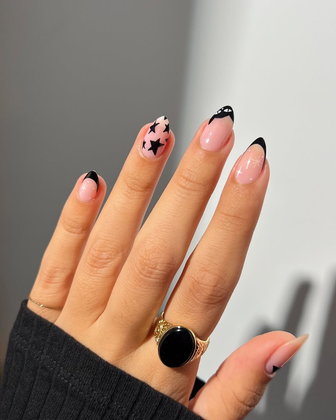 This nude base with crisp black French tips and star accents feels playful but polished. The tiny celestial details add personality without overwhelming the clean structure.