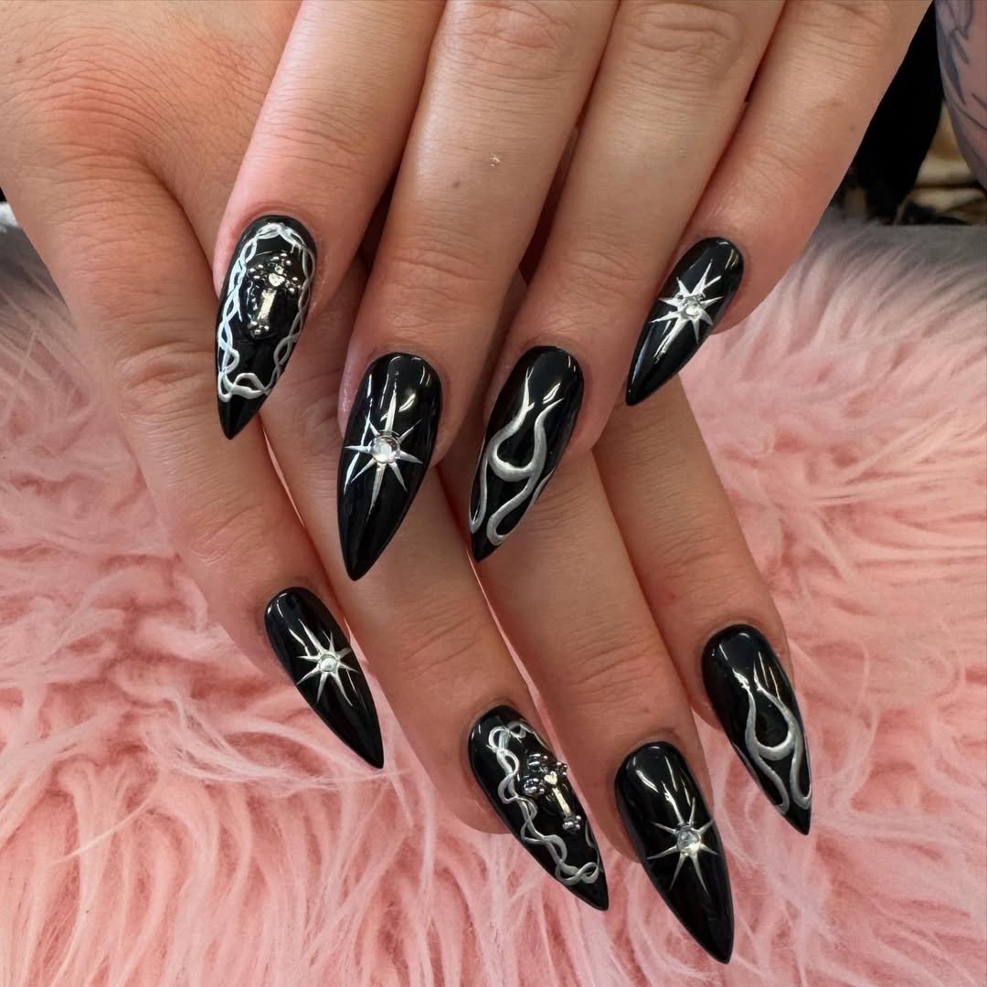 Glossy black stilettos paired with chrome flame accents and starburst gems? This set is straight-up celestial drama. The silver detailing pops against the deep black like constellations in a midnight sky.