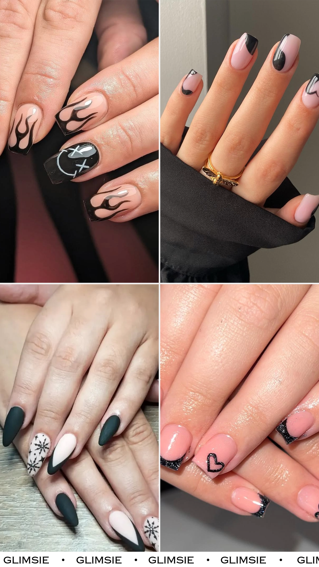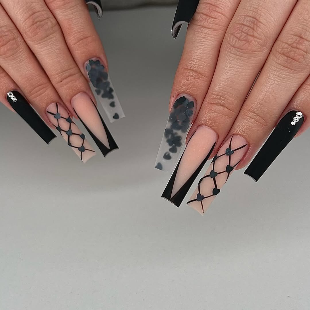 Long, dramatic black tips mixed with matte nude and heart lattice details? This one’s unapologetically bold. It’s giving romantic goth in the best way.