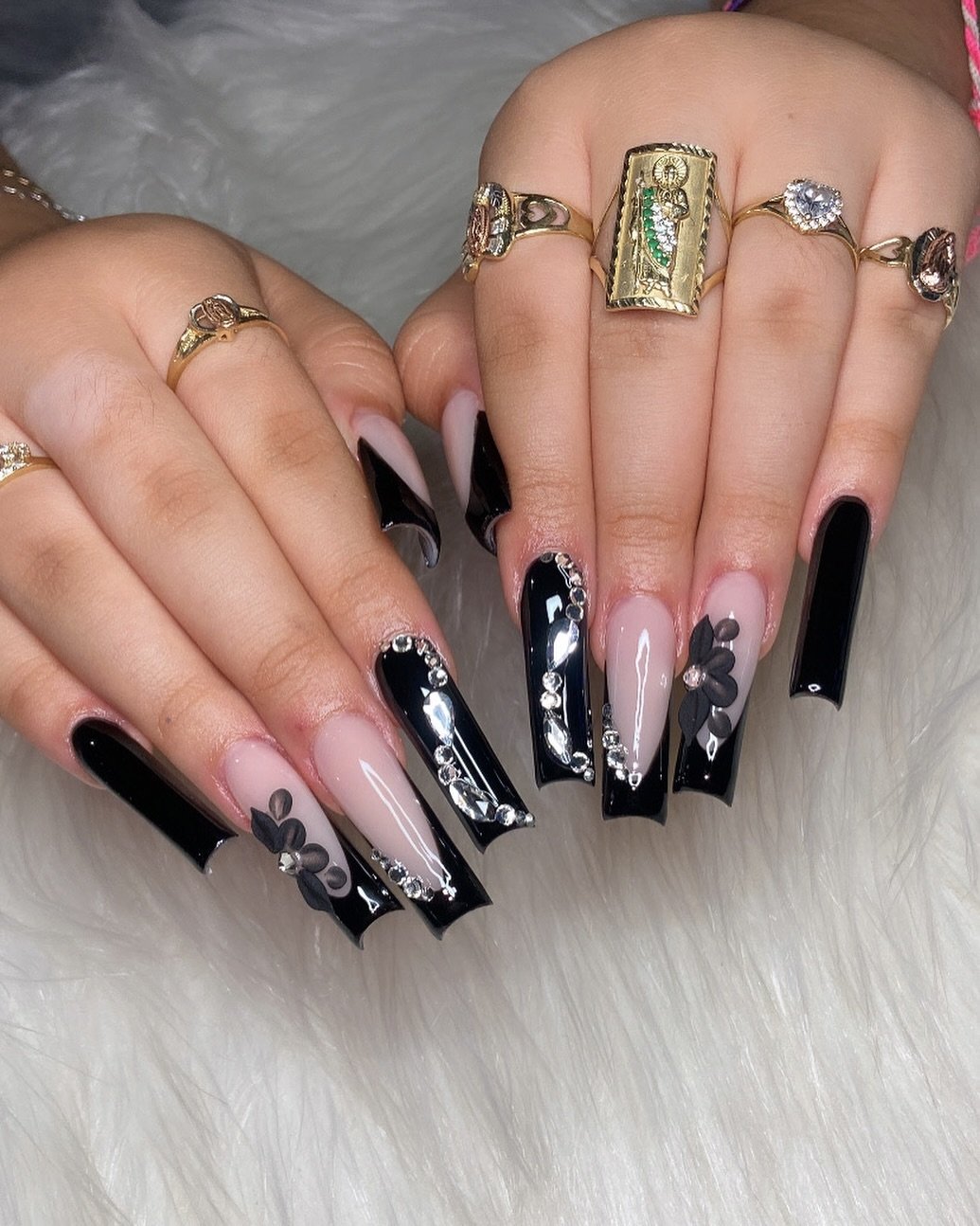 Long coffin black nails mixed with nude accents, florals, and rhinestone borders? This is full glam mode.