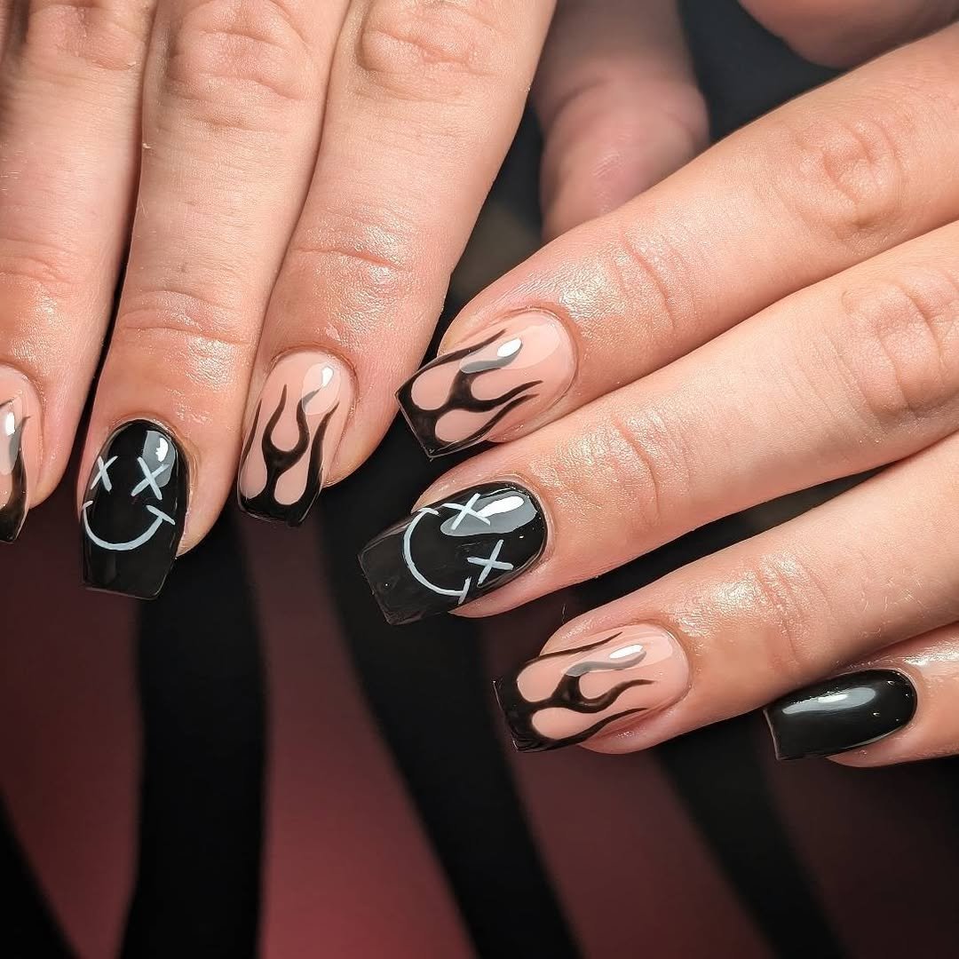 This set is pure alt-girl energy. Glossy black paired with nude flames and those edgy smiley faces? It’s giving grunge, it’s giving main character, it’s giving “don’t text your ex.”