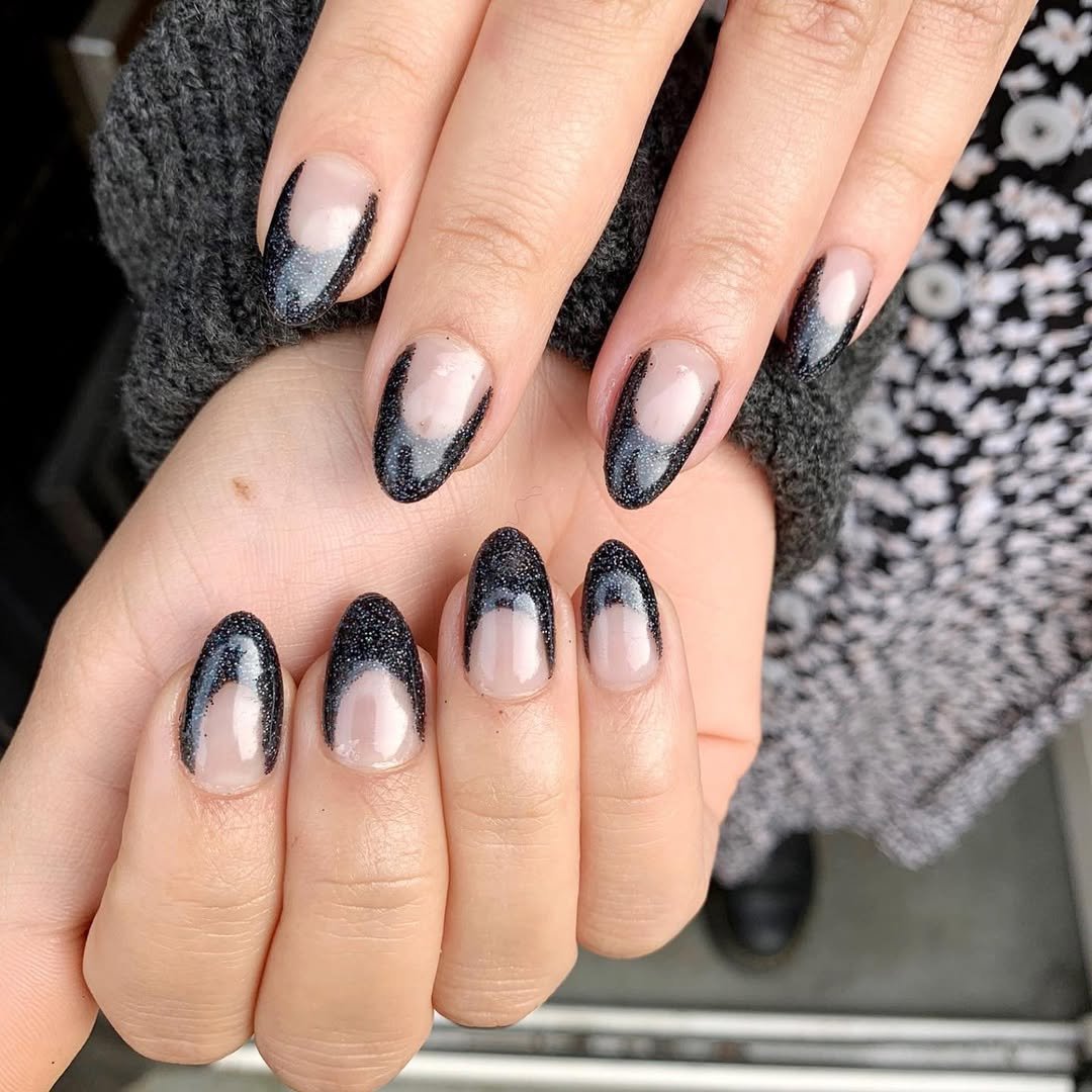 This black glitter fade over a soft nude base is giving “quiet winter night” in the best way. The way the sparkle melts from the edges inward feels soft but still moody — like a smoky French tip with extra depth.