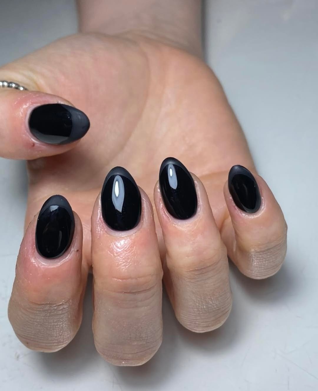 The sharp almond shape adds elegance, while the shimmer keeps it fun. Perfect if you want black nails without going full dark mode.