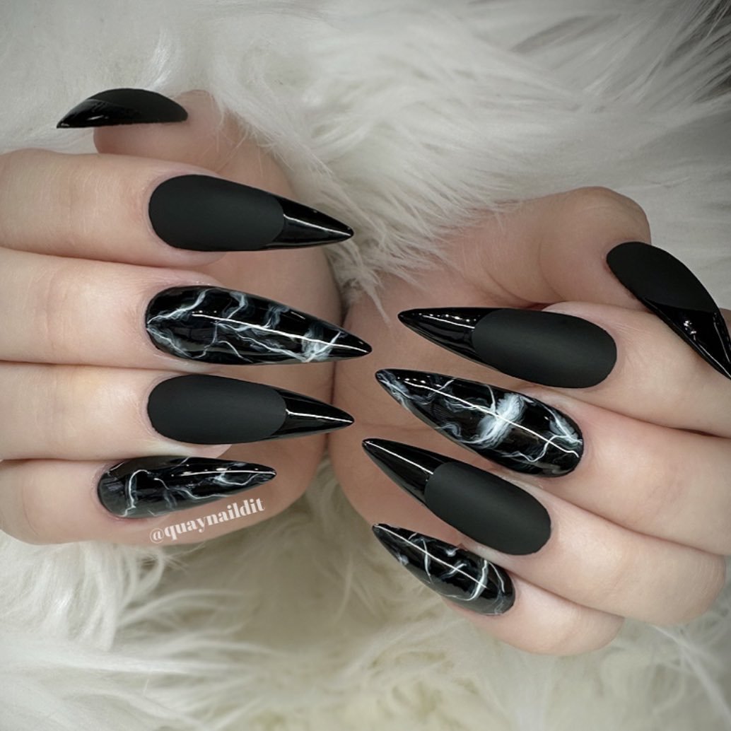 Okay, this set is straight-up powerful. Matte black paired with glossy black marble accents on sharp stilettos? That contrast alone is a moment.