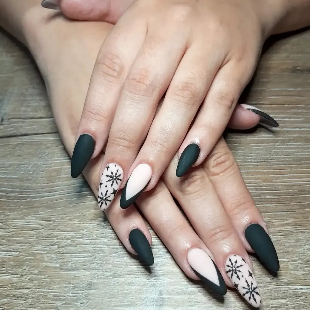 Matte black paired with nude accents and delicate snowflake art? Winter, but make it chic.