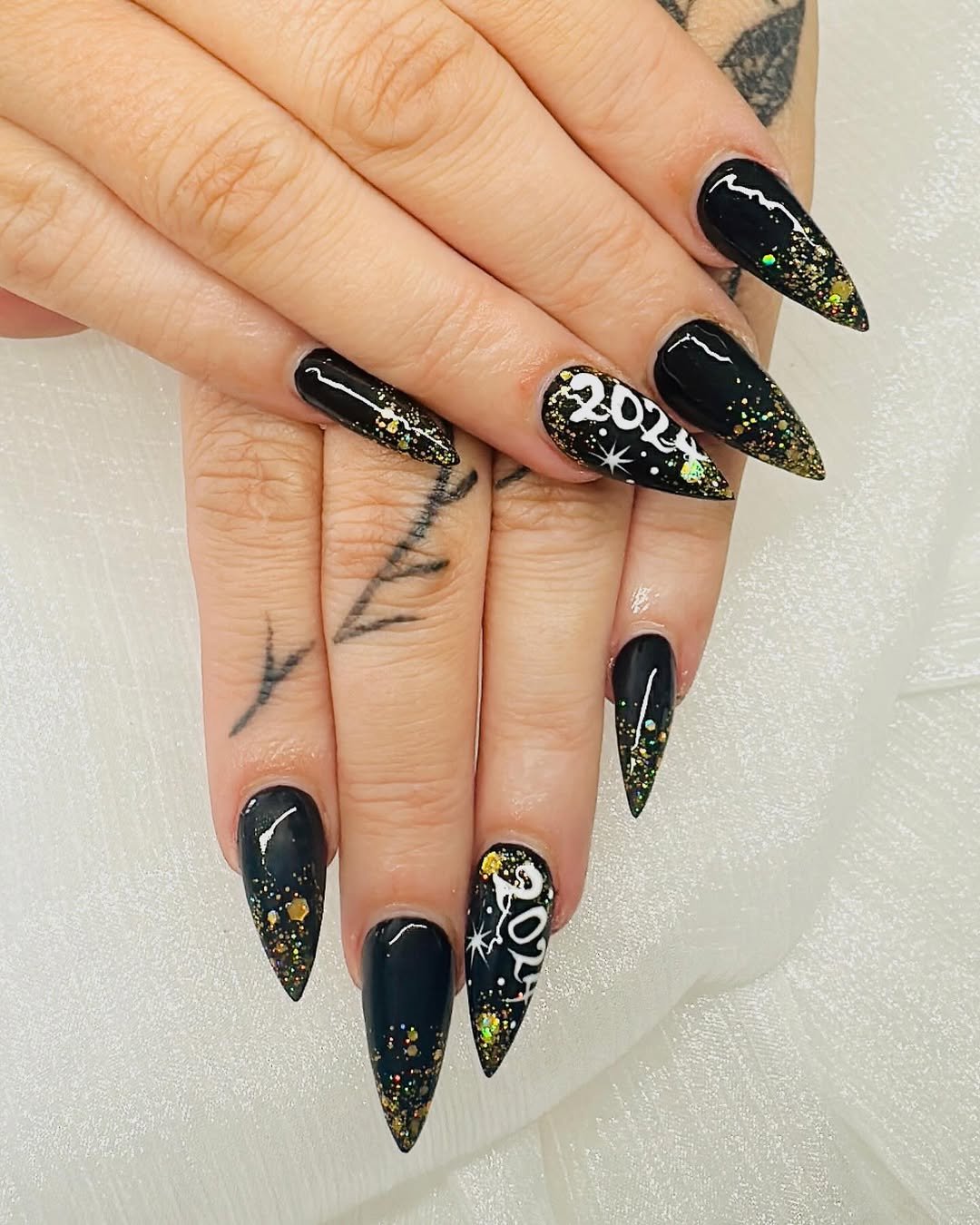 All-black stiletto nails sprinkled with glitter and bold “2024” detailing? This is celebration energy bottled up in a manicure.