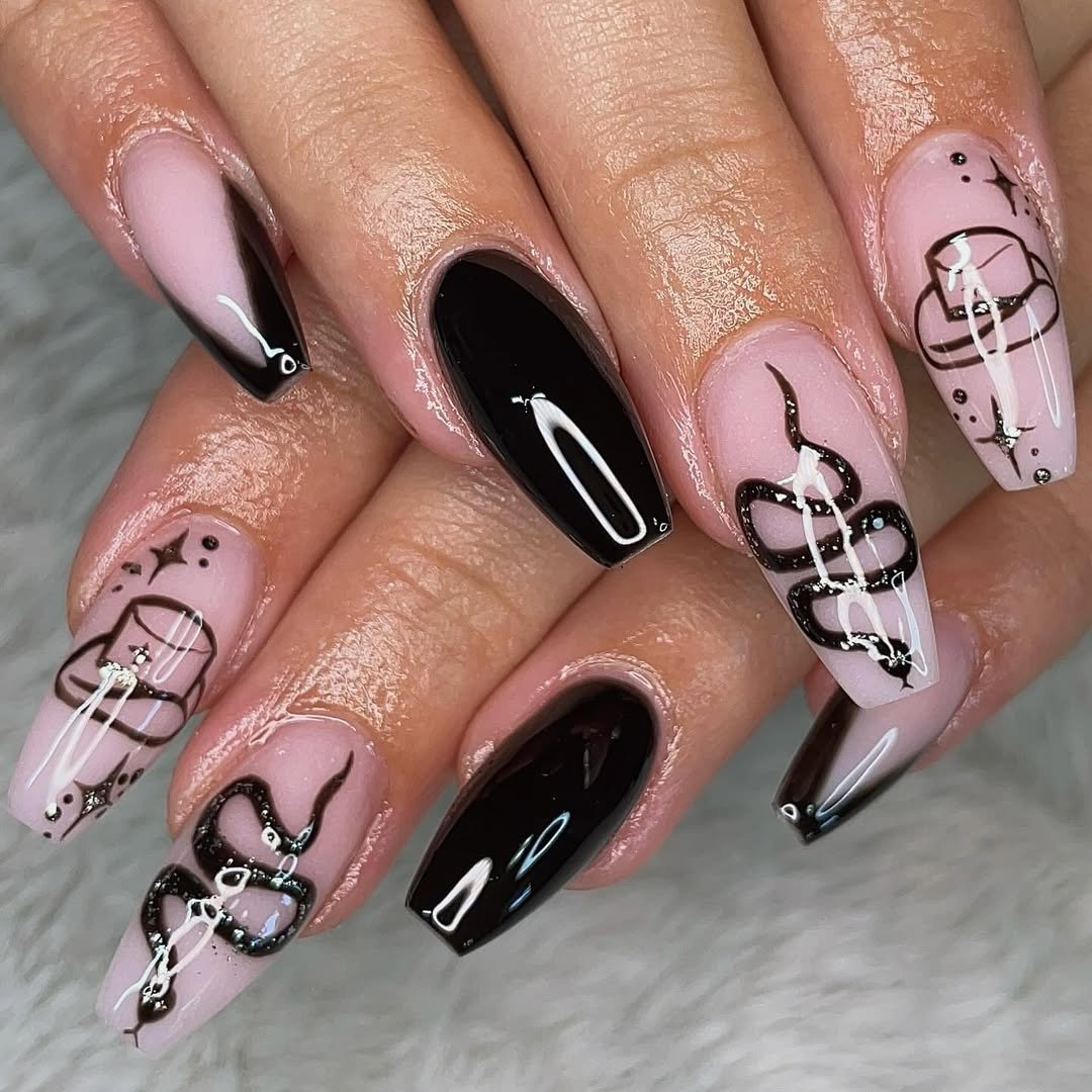 Soft blush pink meets high-gloss black, and then boom — detailed snake art slithering across the nails. It’s feminine, but with a dark twist that makes it feel powerful.