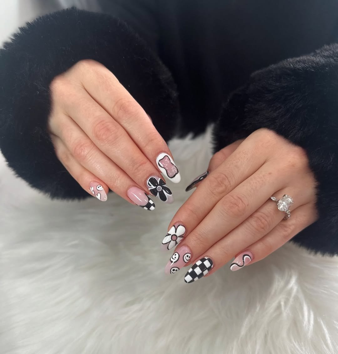 Checkerboard, smiley faces, florals, swirls — and somehow it all works. The black-and-nude combo keeps everything cohesive while the designs bring the fun.