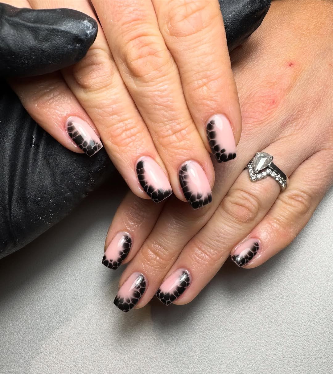 The soft pink base fading into black with that subtle scale-like edge detailing? So smooth. It feels almost airbrushed, but with texture built right into the design.