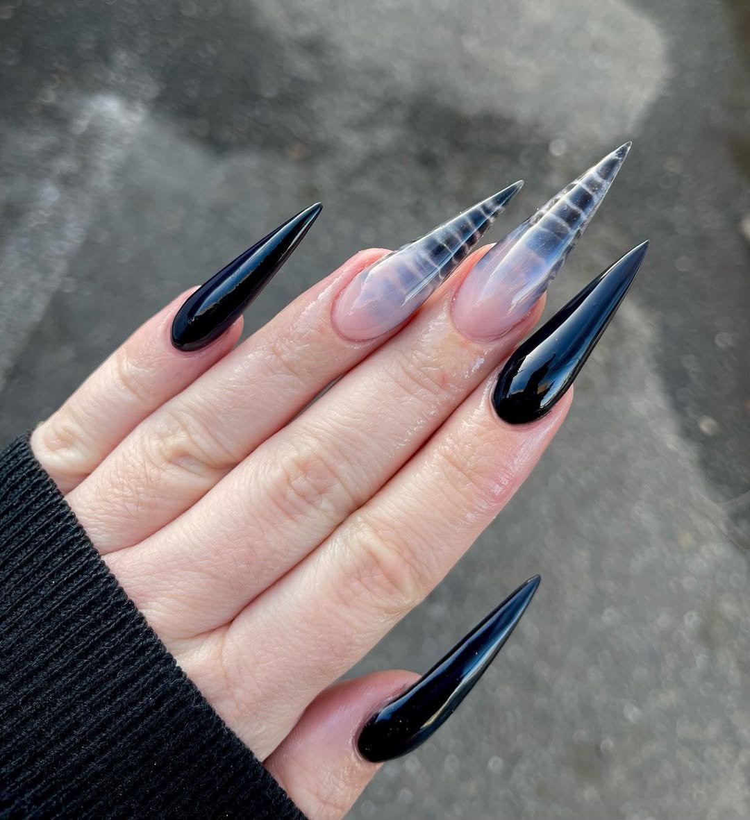 These ultra-long stilettos with glossy black and translucent smoky tips feel futuristic and fierce. The see-through detail adds depth while keeping the black from feeling too heavy.