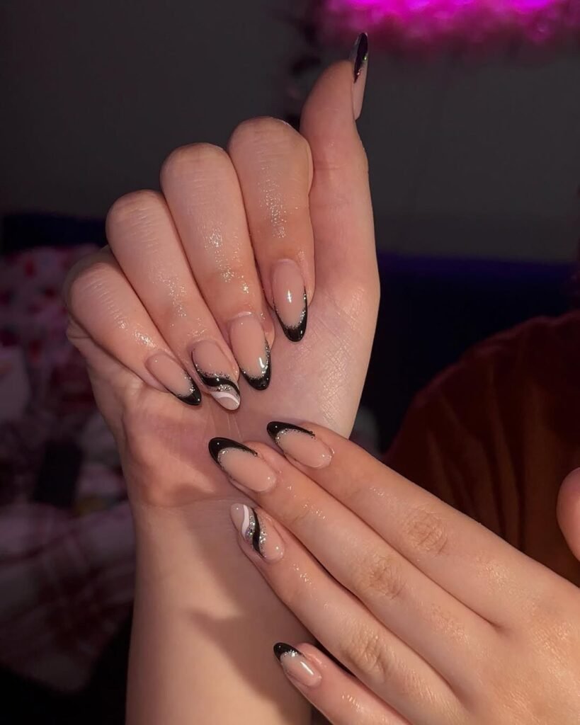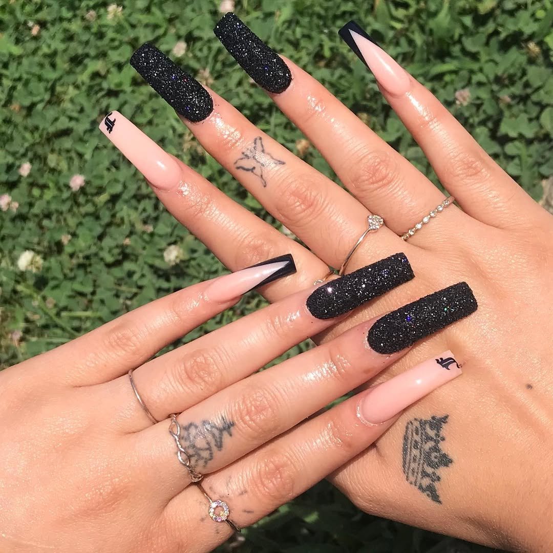 Matte black glitter, nude accents, sharp French edges — this set does not play it safe. The mix of textures alone makes it a standout.