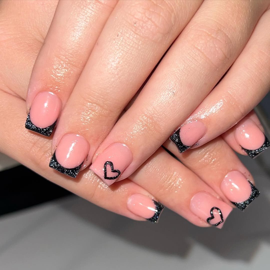 Soft pink nails with black glitter French tips and tiny heart accents — this is flirty meets edgy.
